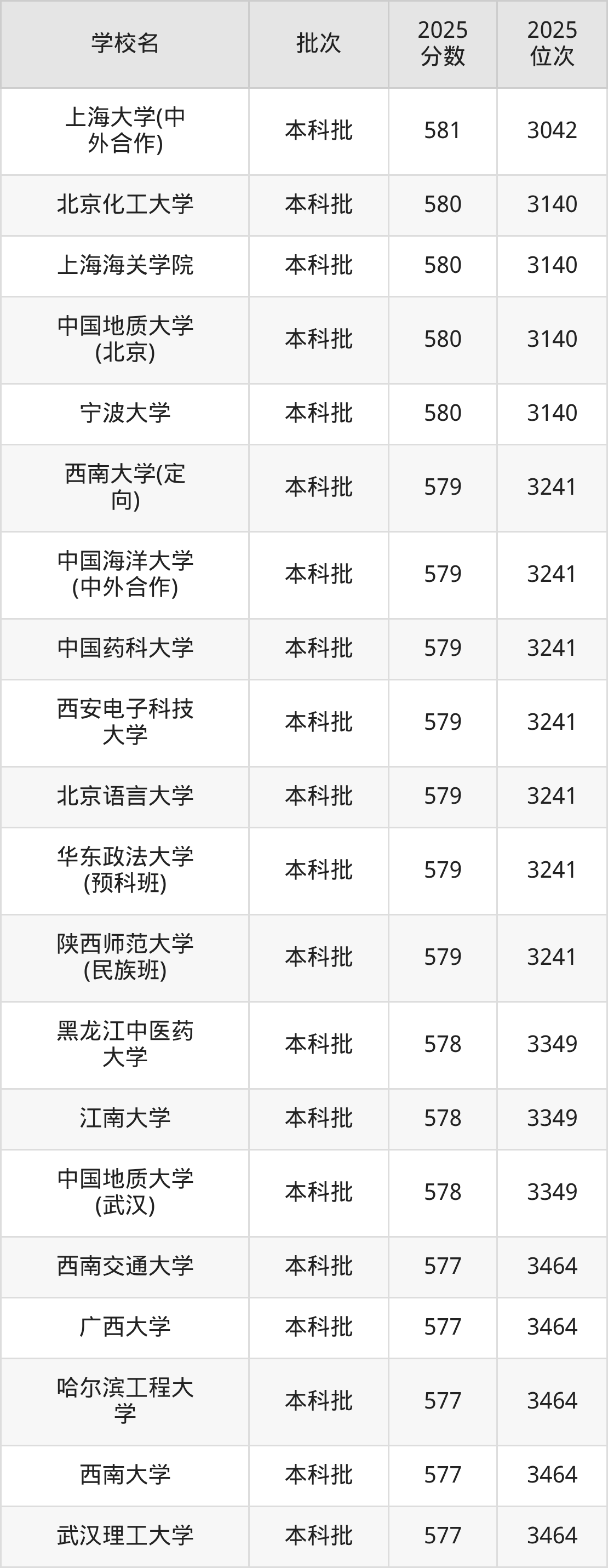 由于高考录取分数线历年波动较大,因此本文以该分数对应的位次排名为大家整理能上的大学名单。