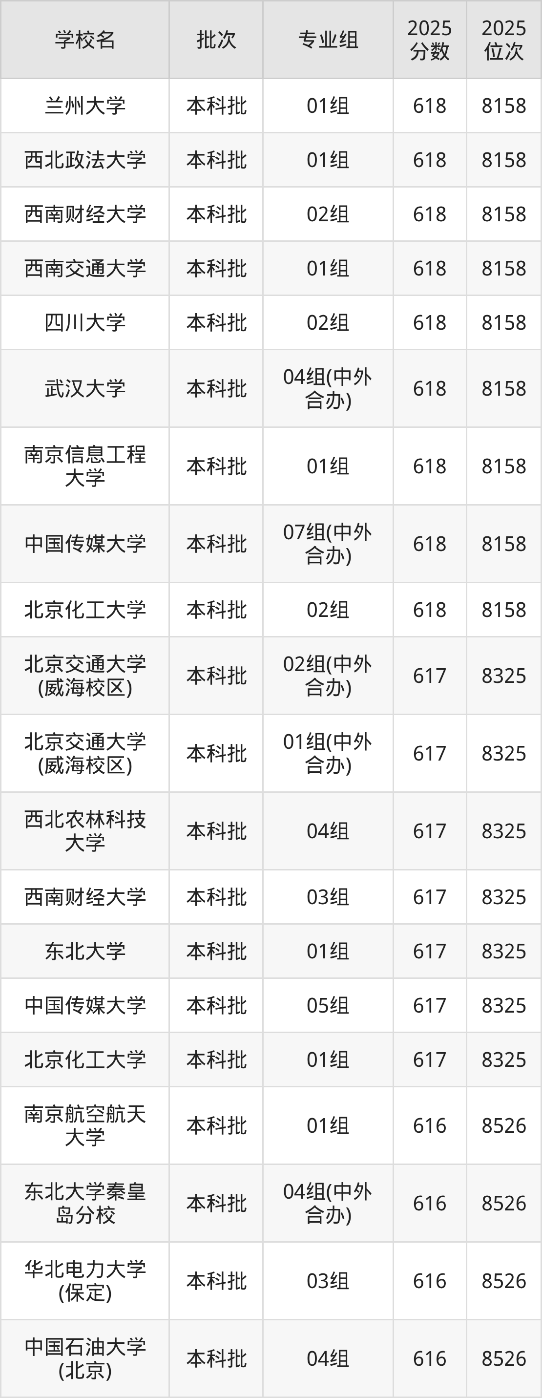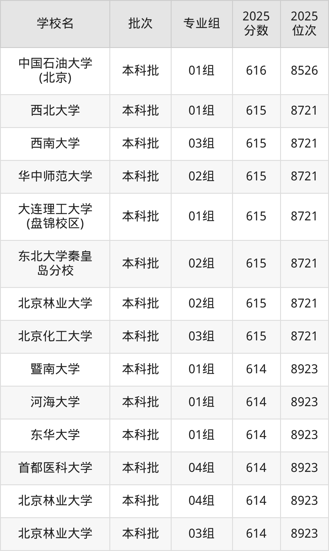 2025年北京高考615分(8527名~8721名)能上的大学有北京化工大学03组、北京林业大学02组、东北大学秦皇岛分校02组、大连理工大学(盘锦校区)01组等。