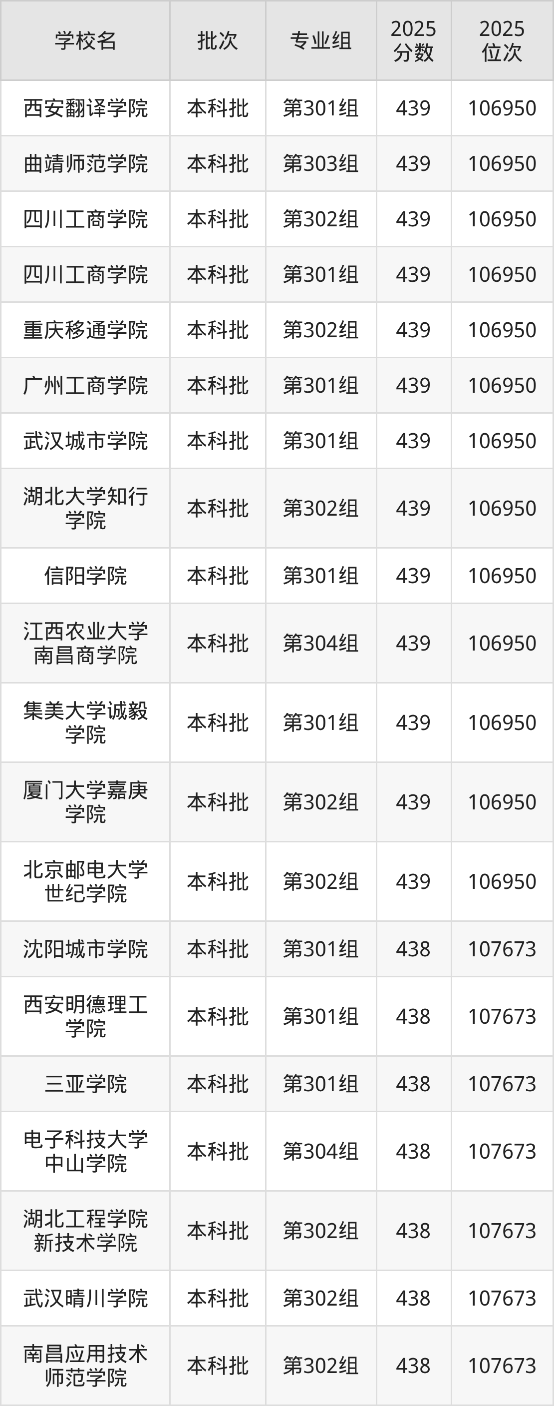 2025年山西高考物理类438分(106951名~107673名)能上的大学有沈阳城市学院第301组、扬州大学广陵学院第301组、江苏师范大学科文学院第305组、南京财经大学红山学院第302组等。