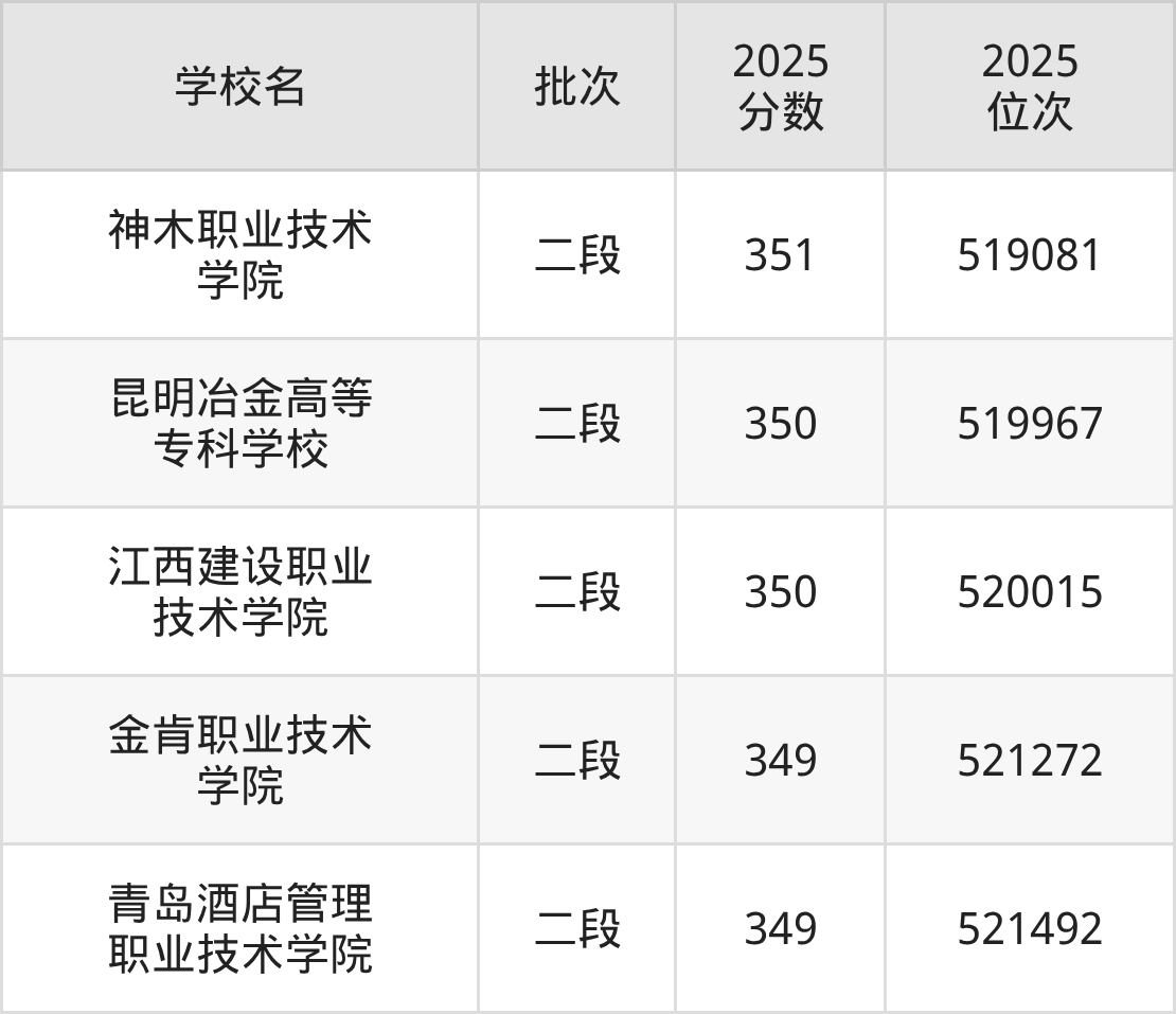2025年山东高考350分(519458名~521271名)能上的大学有江西建设职业技术学院、昆明冶金高等专科学校。