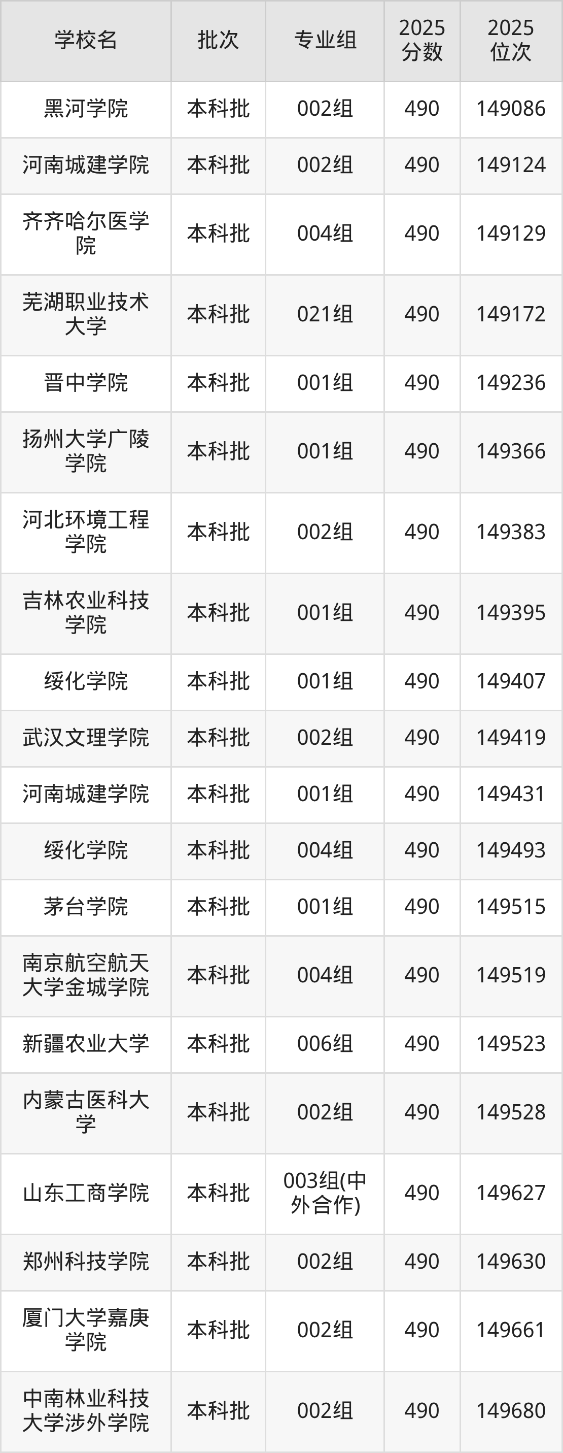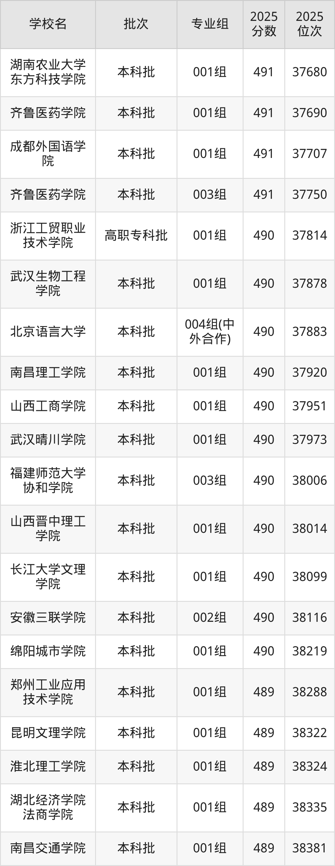 2025年安徽高考历史类490分(37789名~38251名)能上的大学有北京语言大学004组(中外合作)、绵阳城市学院001组、南昌理工学院001组、山西工商学院001组等。