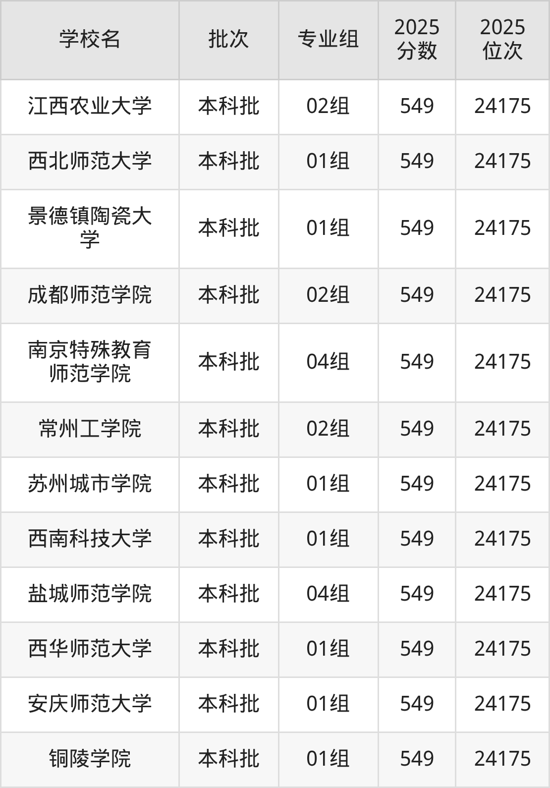 2025年江苏高考物理类550分(235名~240名)能上的大学有常州大学04组、西交利物浦大学04组(中外合作)、安徽师范大学04组、安徽理工大学01组等。