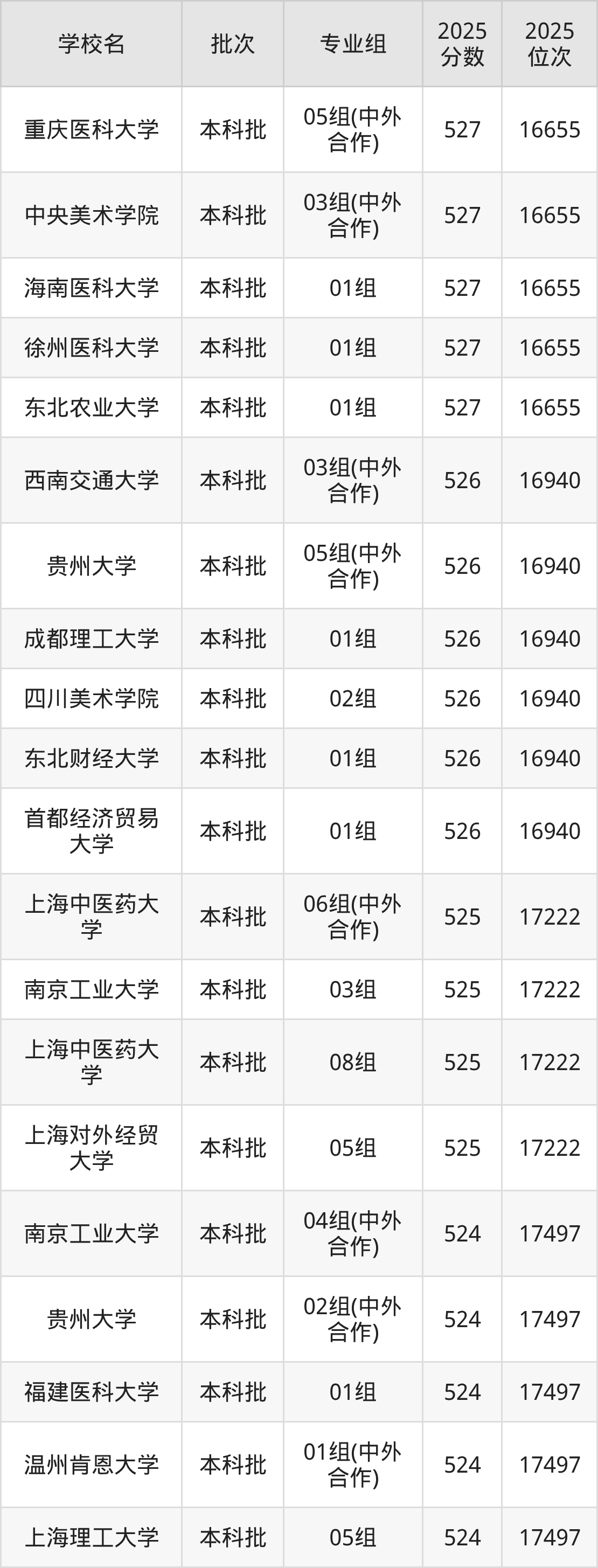 这些都是2026年高考16941名~17222名考生可以报考的大学,更多学校名单如下表所示: