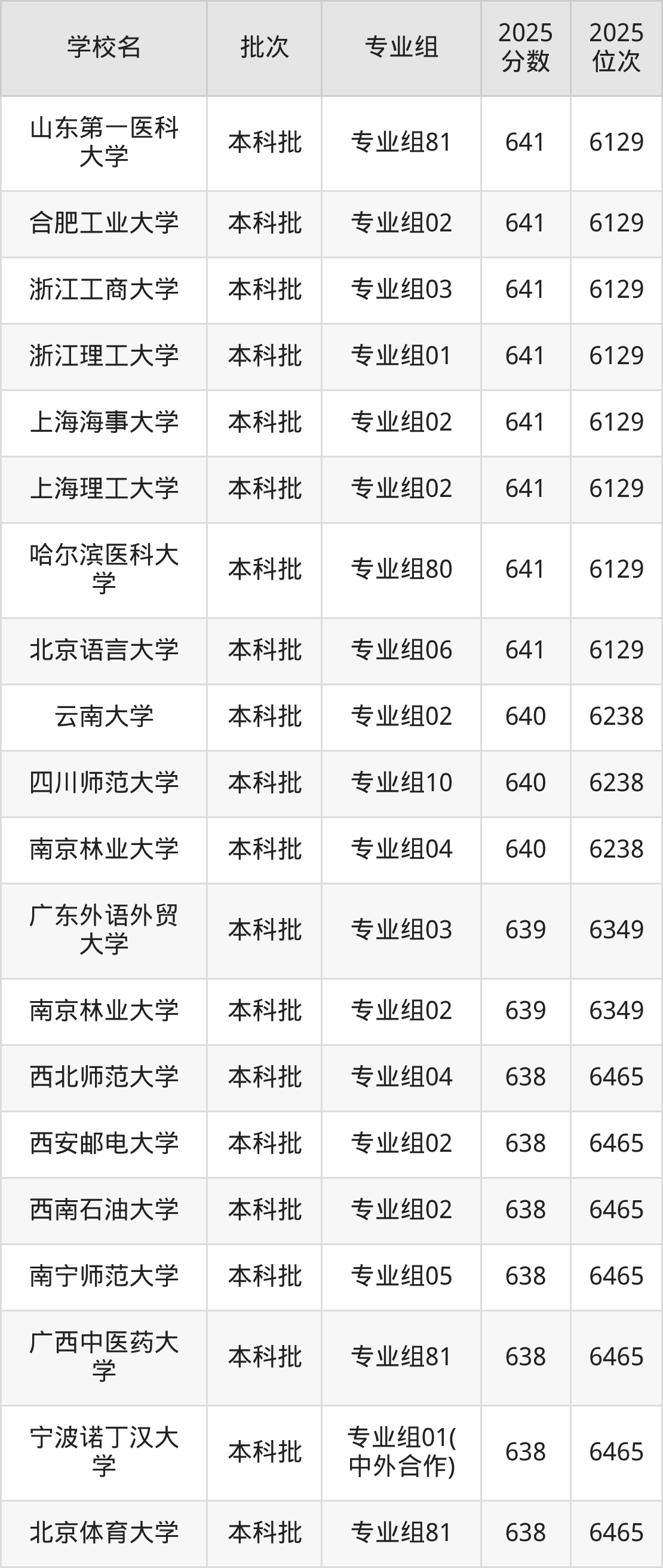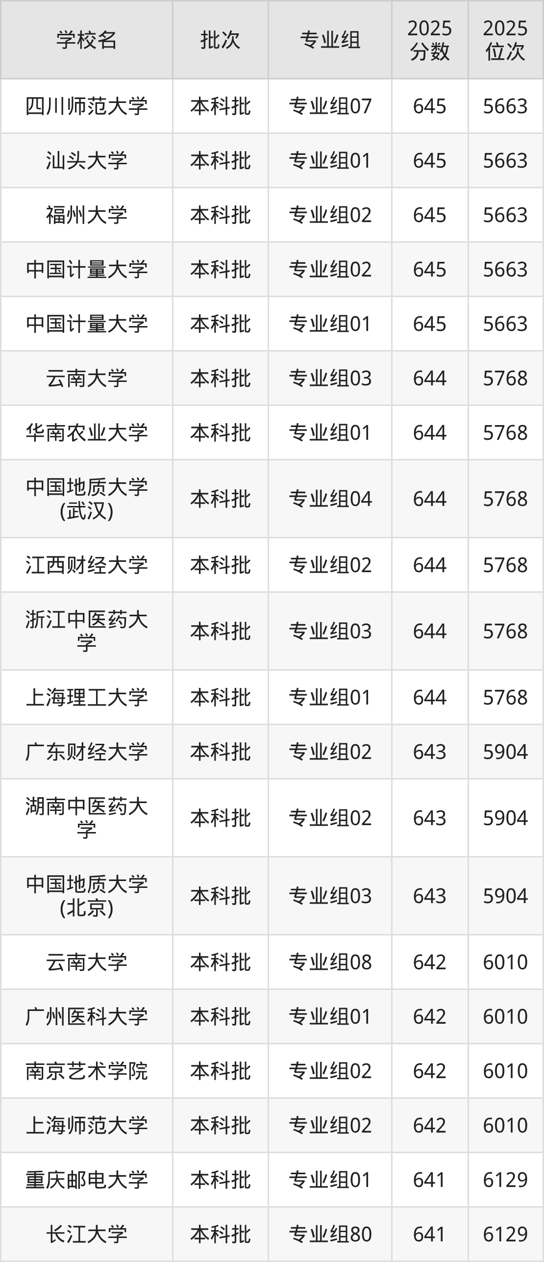 2025年海南高考640分(6130名~6238名)能上的大学有南京林业大学专业组04、四川师范大学专业组10、云南大学专业组02。