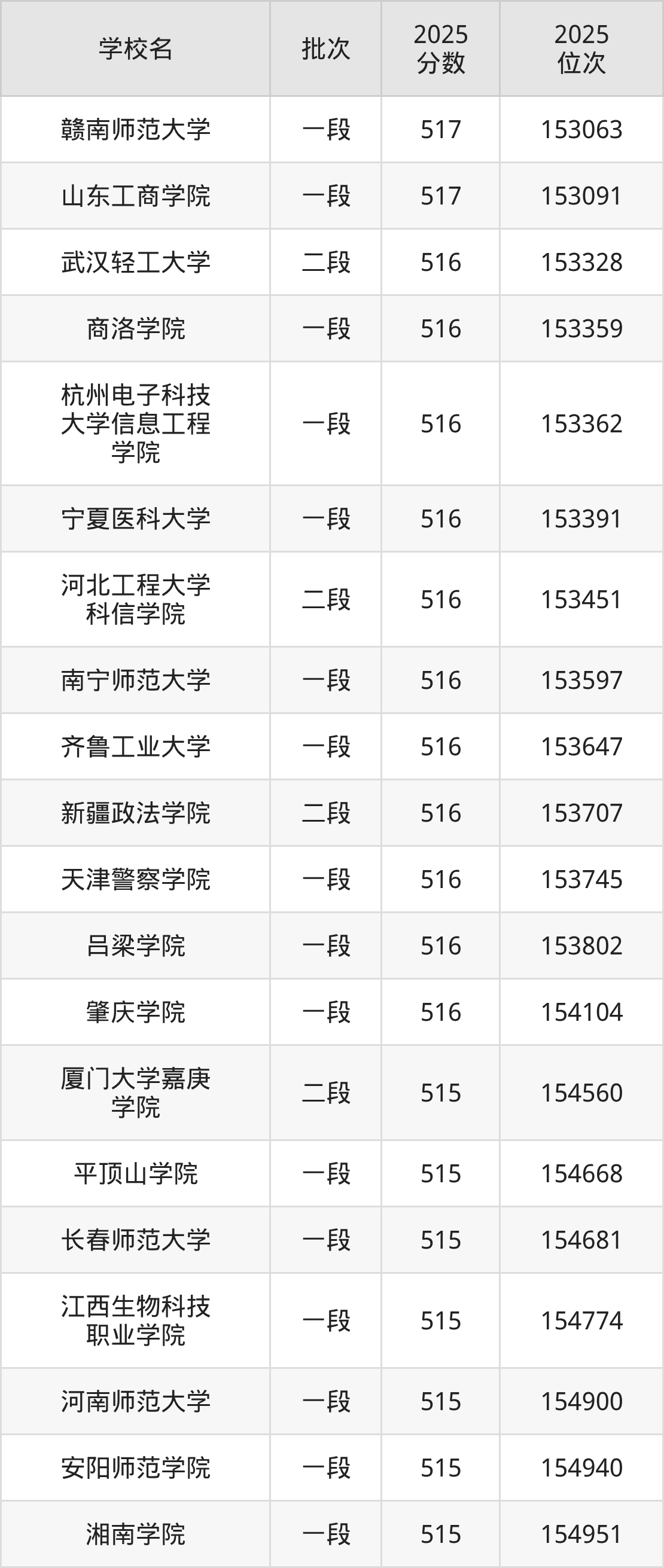 这些都是2026年高考153311名~154495名考生可以报考的大学,更多学校名单如下表所示: