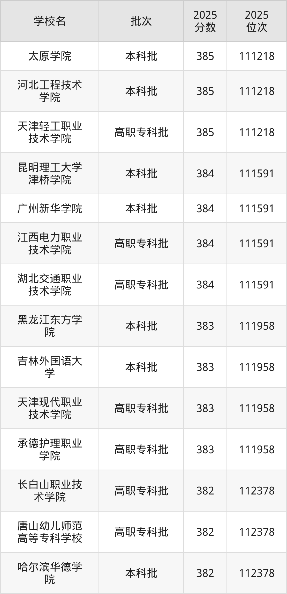 2025年辽宁高考物理类383分(111592名~111958名)能上的大学有吉林外国语大学、黑龙江东方学院、承德护理职业学院、天津现代职业技术学院。