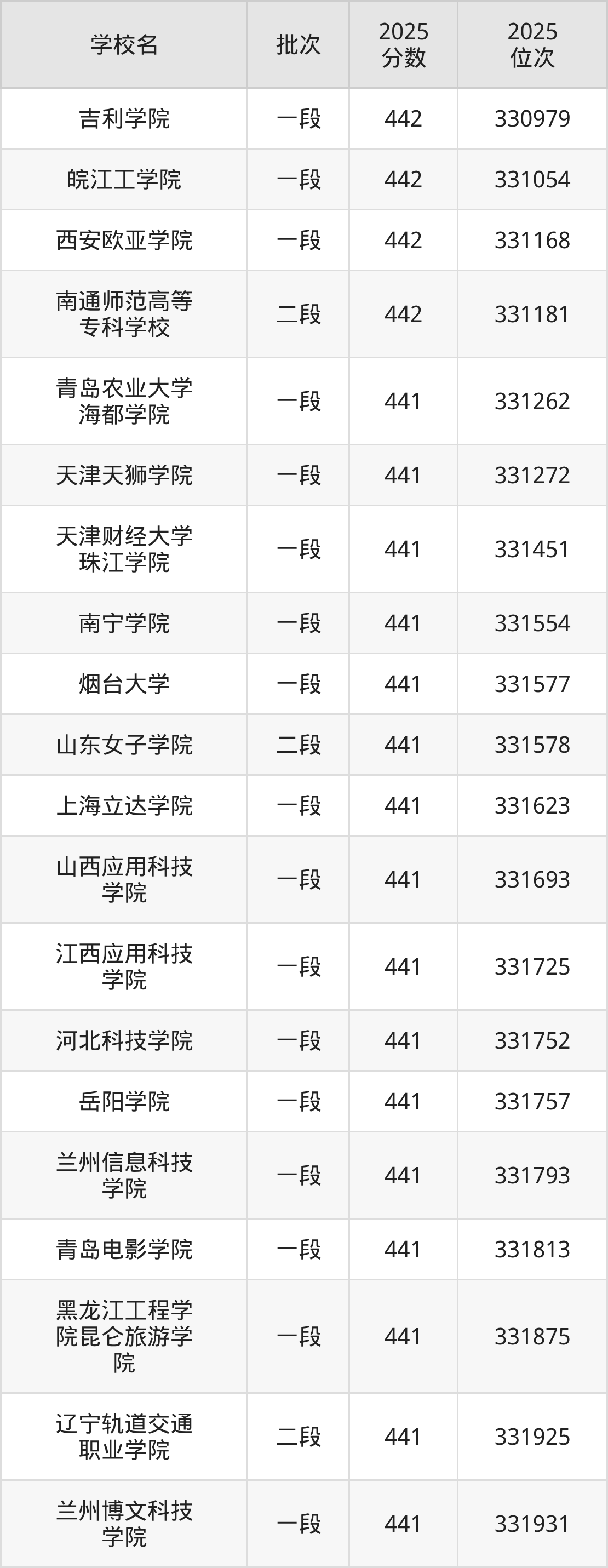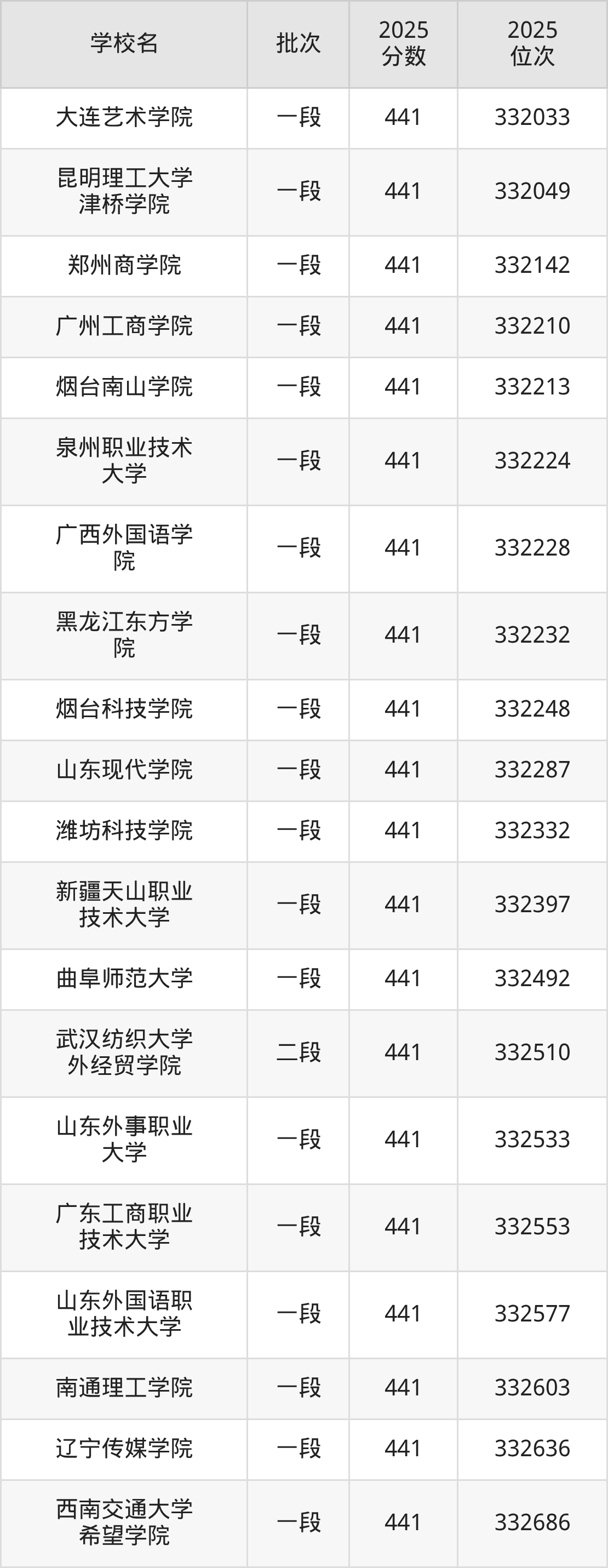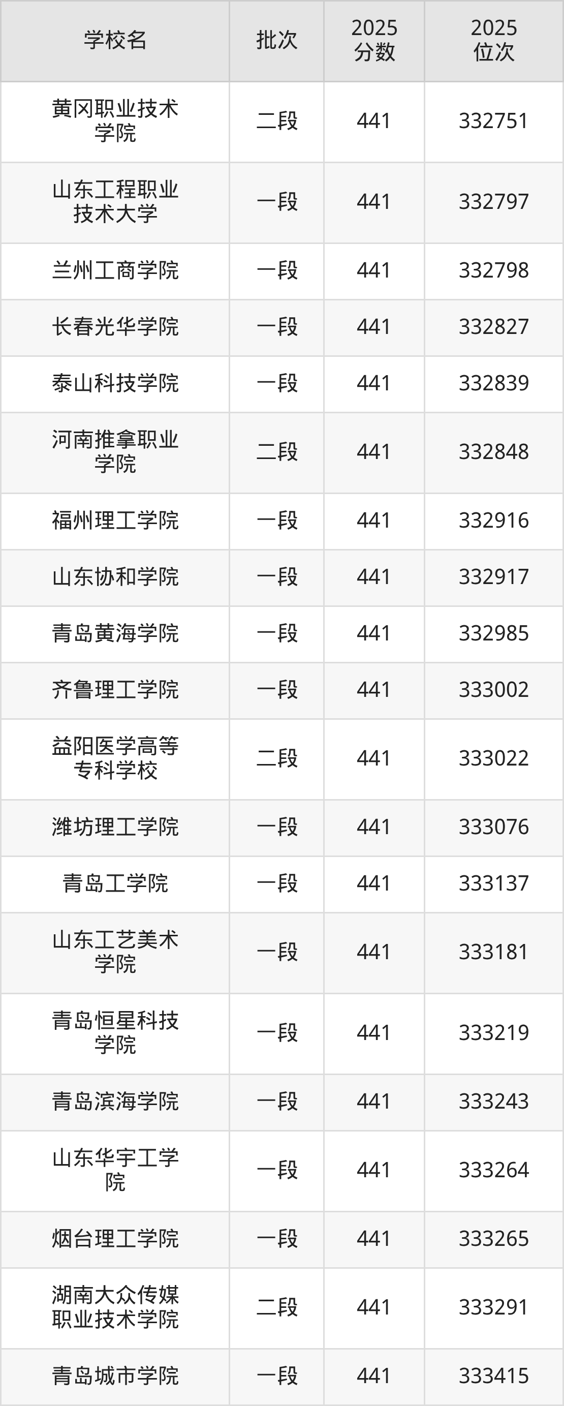 2025年山东高考441分(331241名~333469名)能上的大学有益阳医学高等专科学校、河南推拿职业学院、山东华宇工学院、山东工程职业技术大学等。