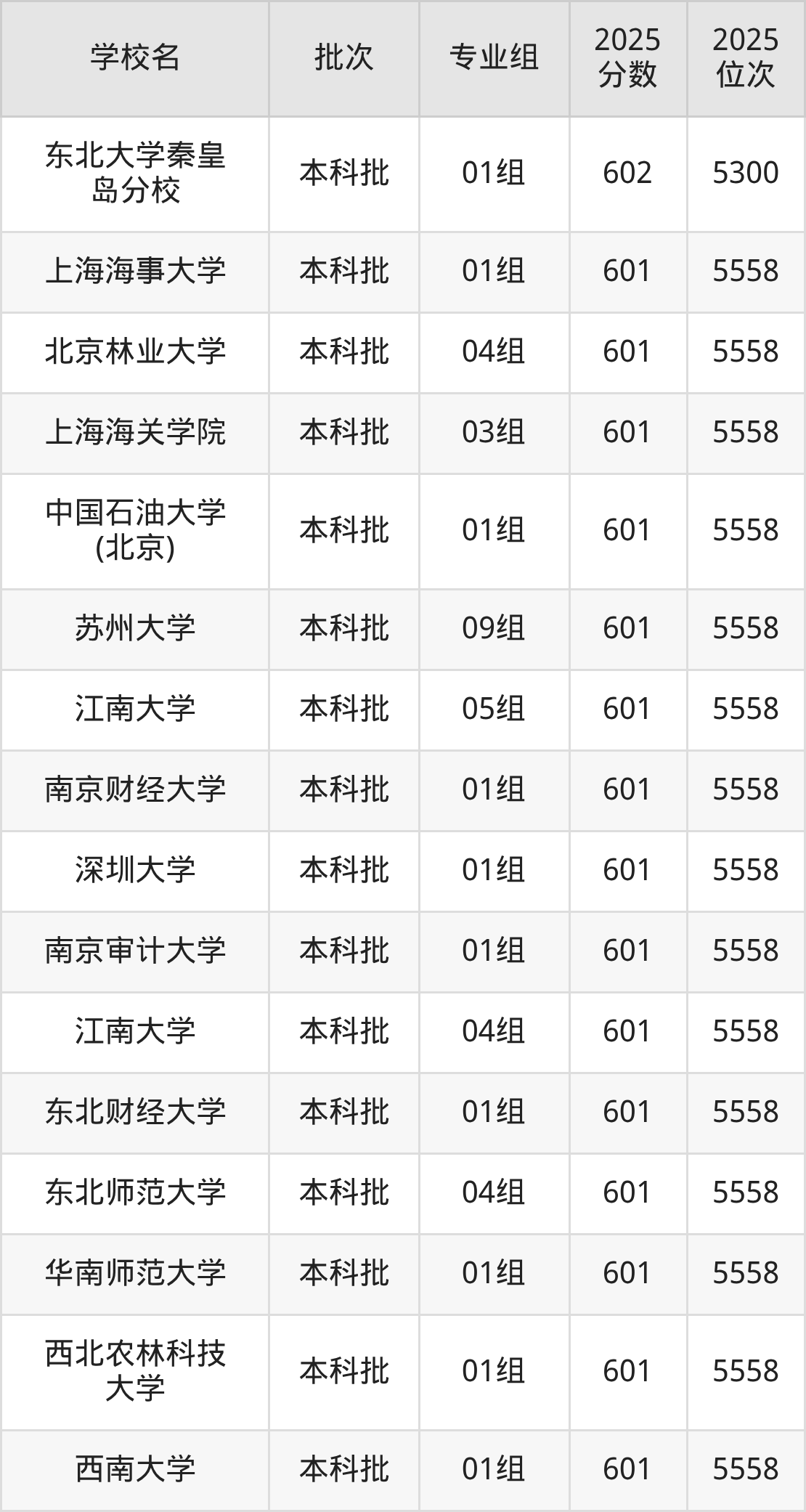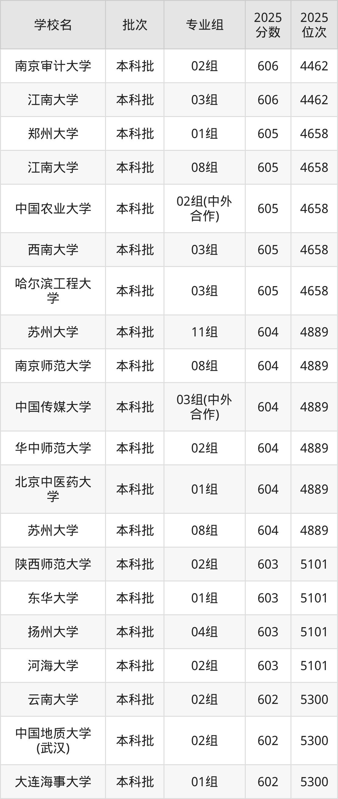 2025年江苏高考历史类603分(4890名~5101名)能上的大学有河海大学02组、扬州大学04组、东华大学01组、陕西师范大学02组。