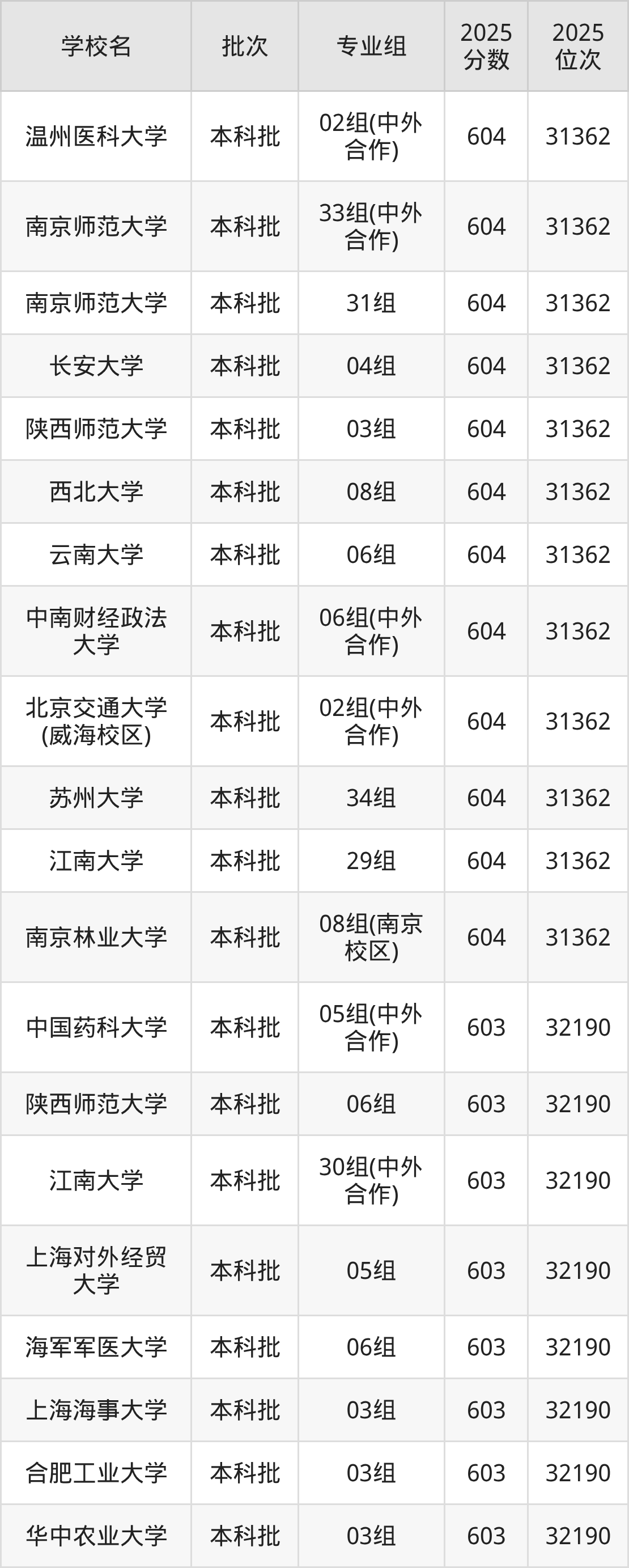 2025年江苏高考物理类603分(31363名~32190名)能上的大学有海军军医大学06组、中国药科大学05组(中外合作)、江南大学30组(中外合作)、上海对外经贸大学05组等。