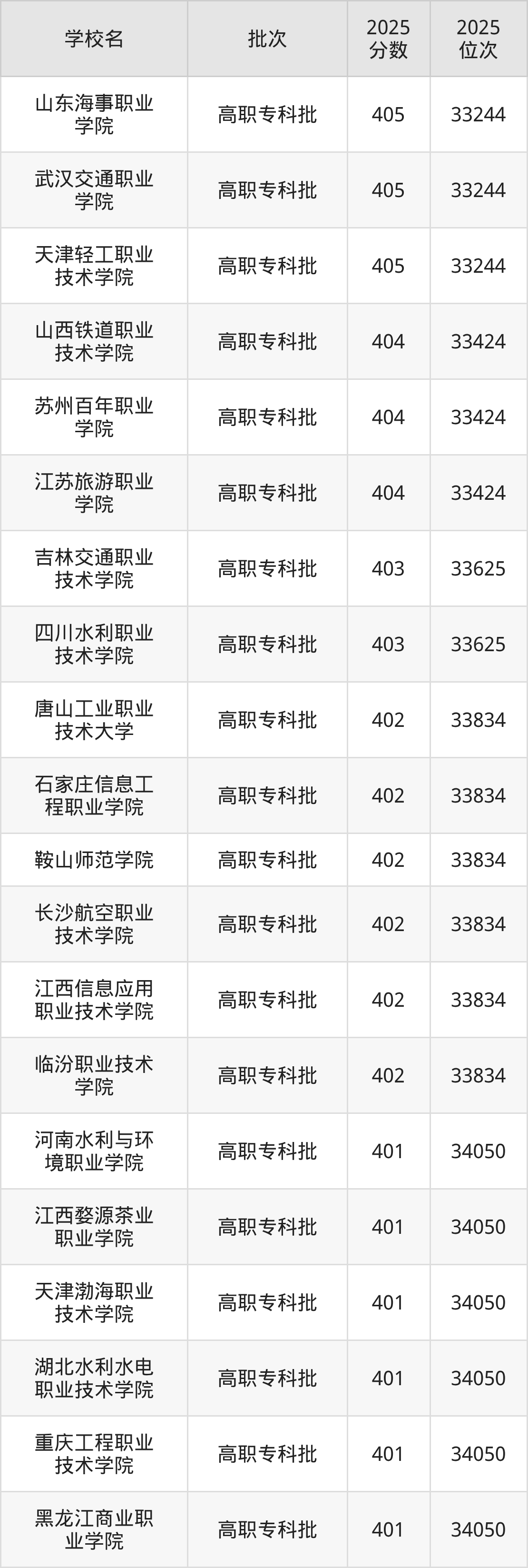 2025年辽宁高考历史类403分(33425名~33625名)能上的大学有四川水利职业技术学院、吉林交通职业技术学院。
