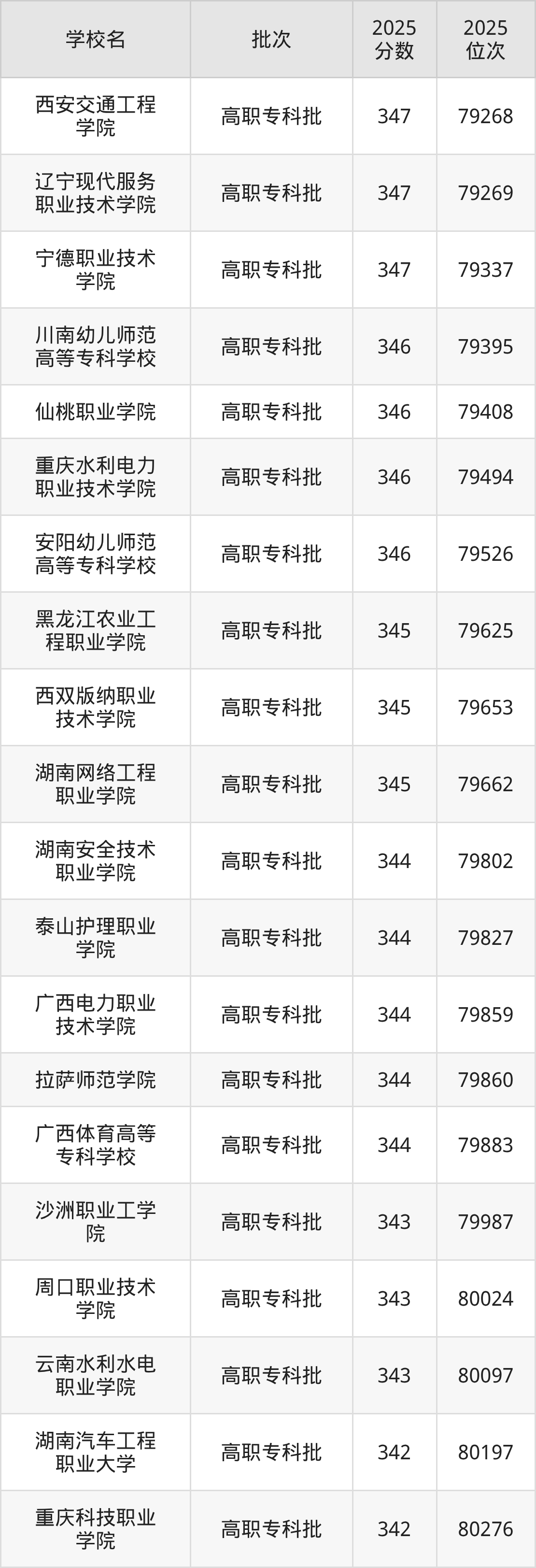 2025年贵州高考历史类344分(79763名~79975名)能上的大学有广西体育高等专科学校、广西电力职业技术学院、湖南安全技术职业学院、泰山护理职业学院等。
