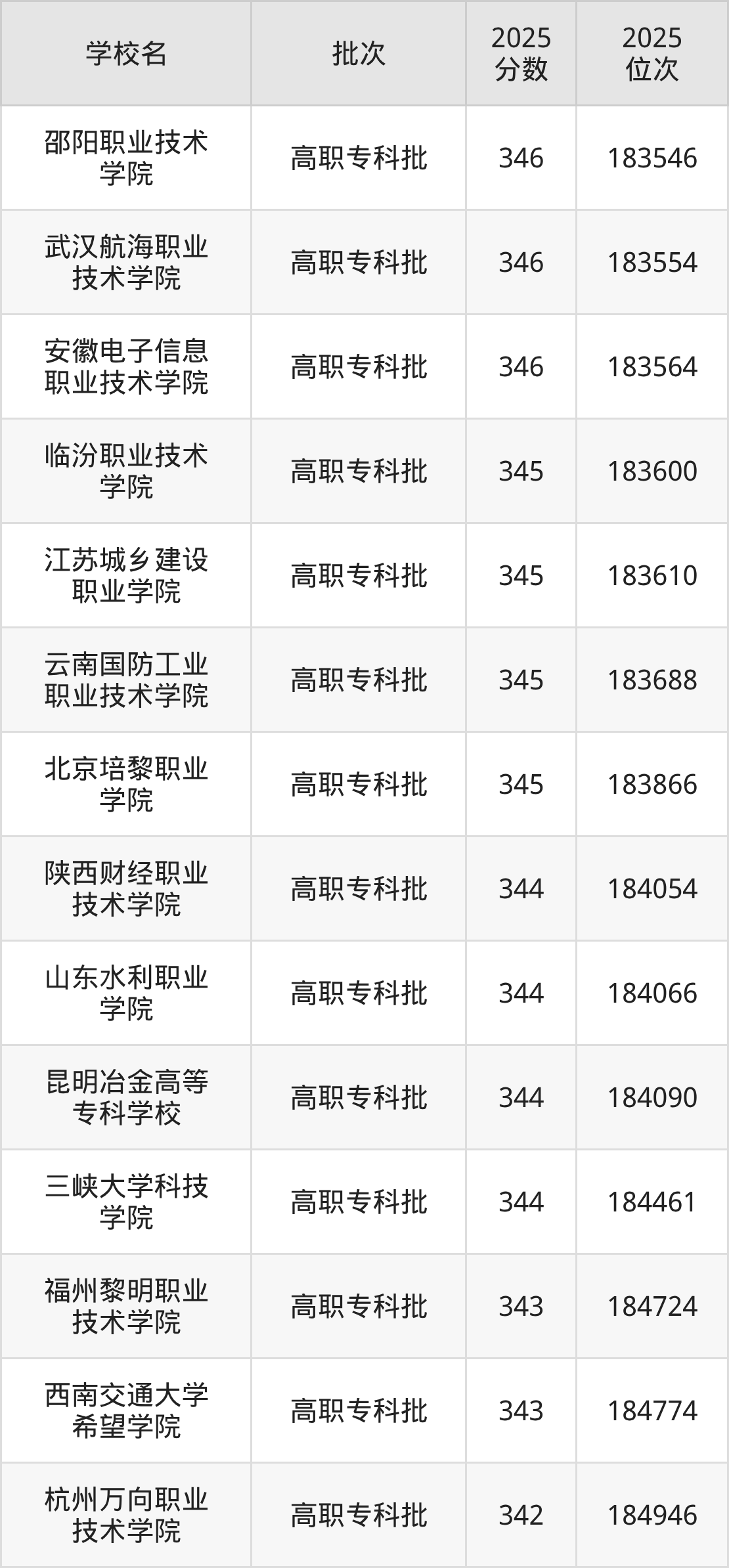 2025年贵州高考物理类344分(184014名~184476名)能上的大学有山东水利职业学院、三峡大学科技学院、陕西财经职业技术学院、昆明冶金高等专科学校。