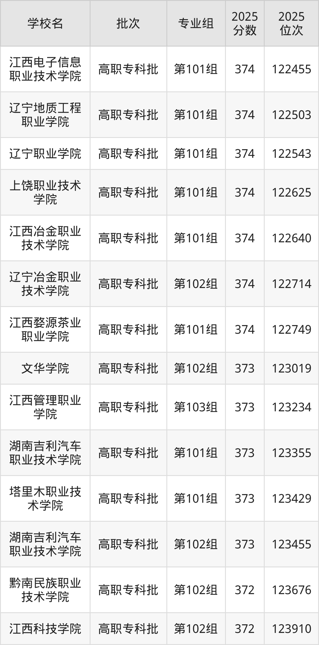 2025年江西高考历史类373分(122826名~123577名)能上的大学有文华学院第102组、塔里木职业技术学院第101组、湖南吉利汽车职业技术学院第101组、湖南吉利汽车职业技术学院第102组等。