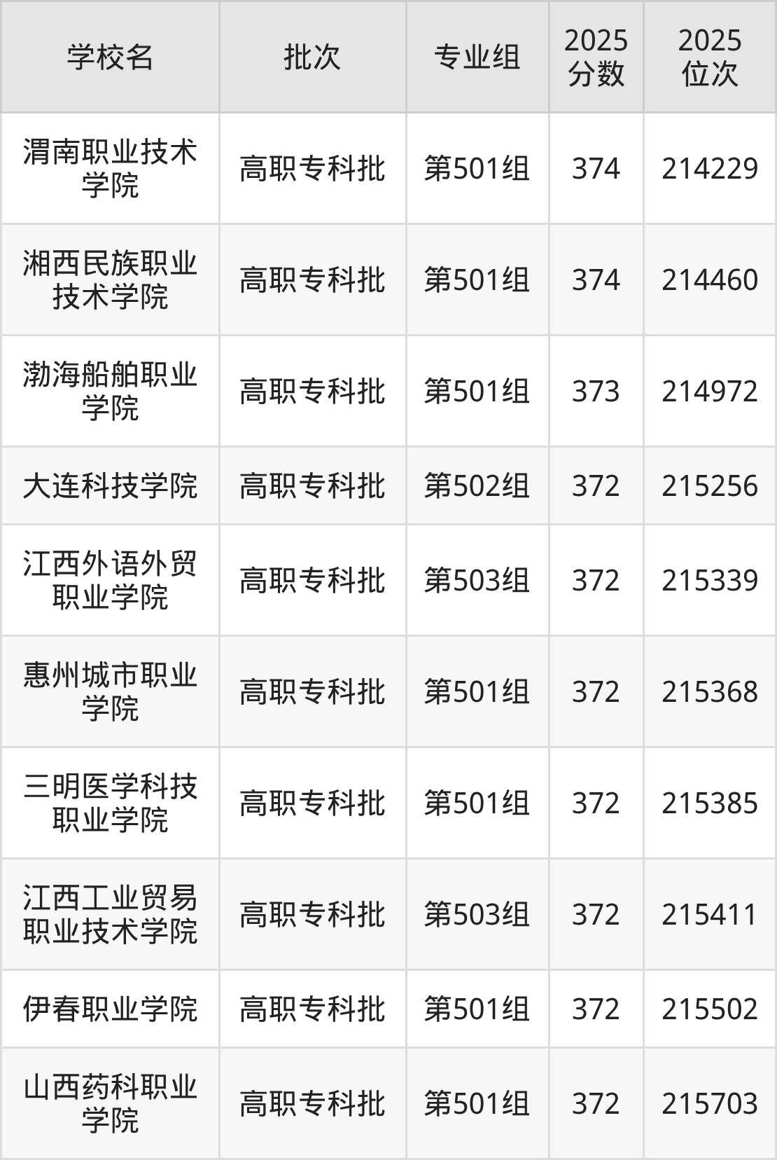 另外录取位次低于该区间(较稳妥)的有大连科技学院第502组(215256名)、江西外语外贸职业学院第503组(215339名)等;录取位次高于该区间(可冲)的有湘西民族职业技术学院第501组(214460名)、渭南职业技术学院第501组(214229名)等。