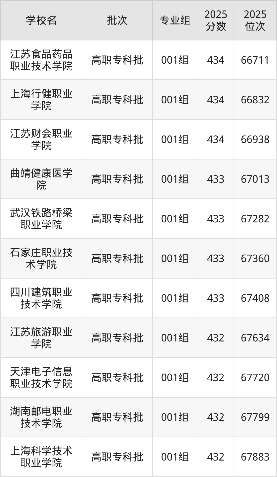 2025年安徽高考历史类433分(67010名~67520名)能上的大学有曲靖健康医学院001组、石家庄职业技术学院001组、四川建筑职业技术学院001组、武汉铁路桥梁职业学院001组。