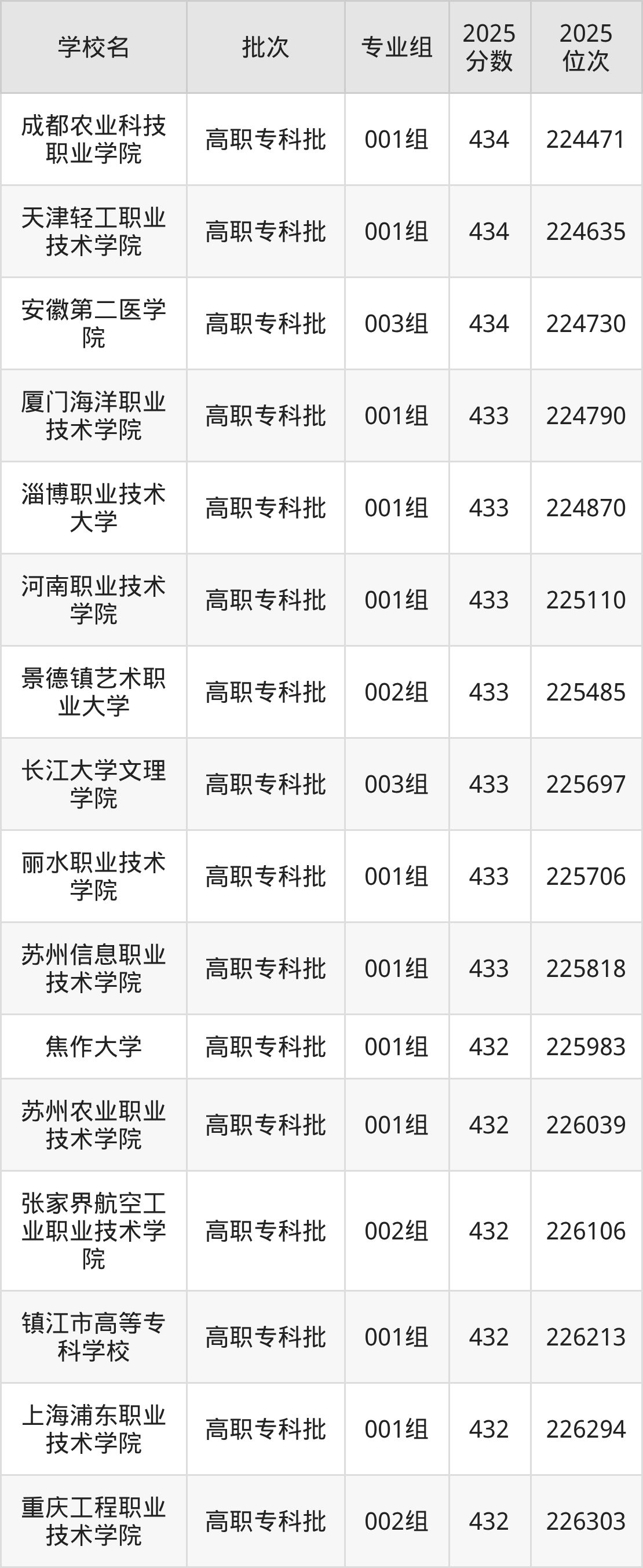 2025年安徽高考物理类433分(224758名~225868名)能上的大学有河南职业技术学院001组、景德镇艺术职业大学002组、丽水职业技术学院001组、苏州信息职业技术学院001组等。