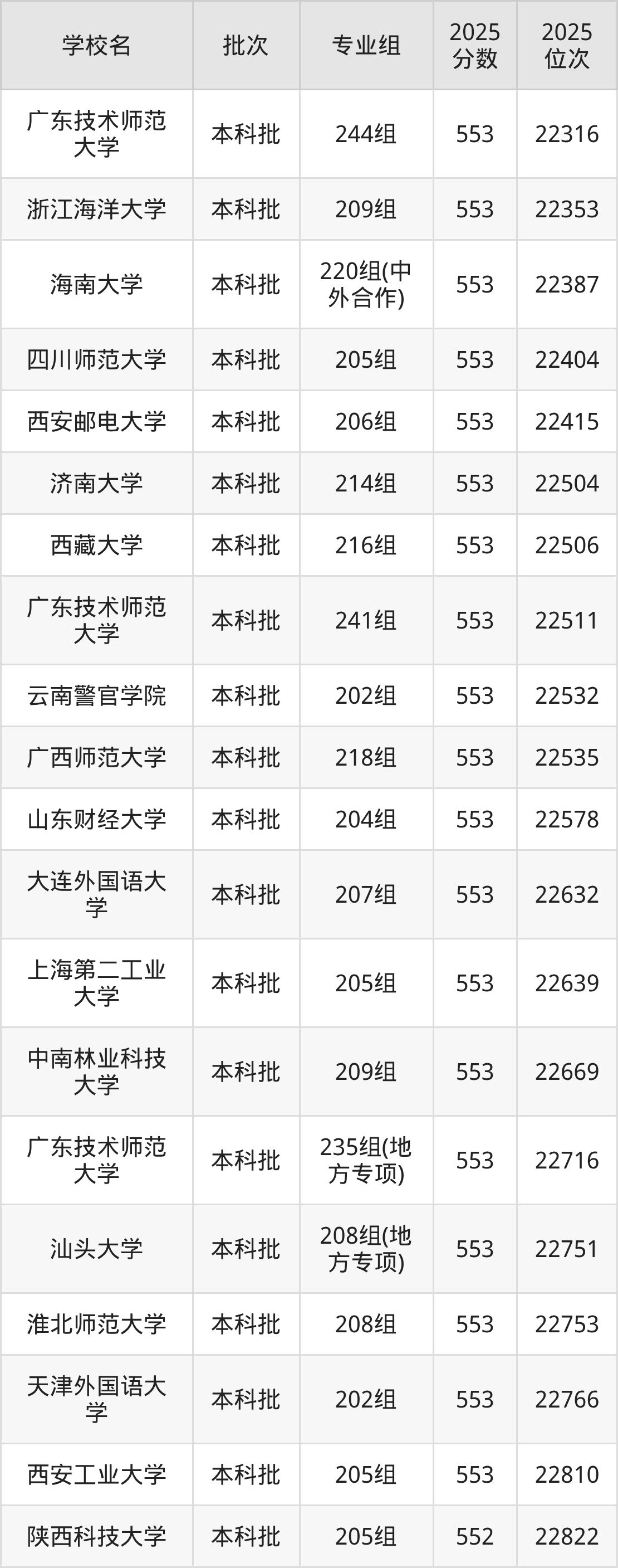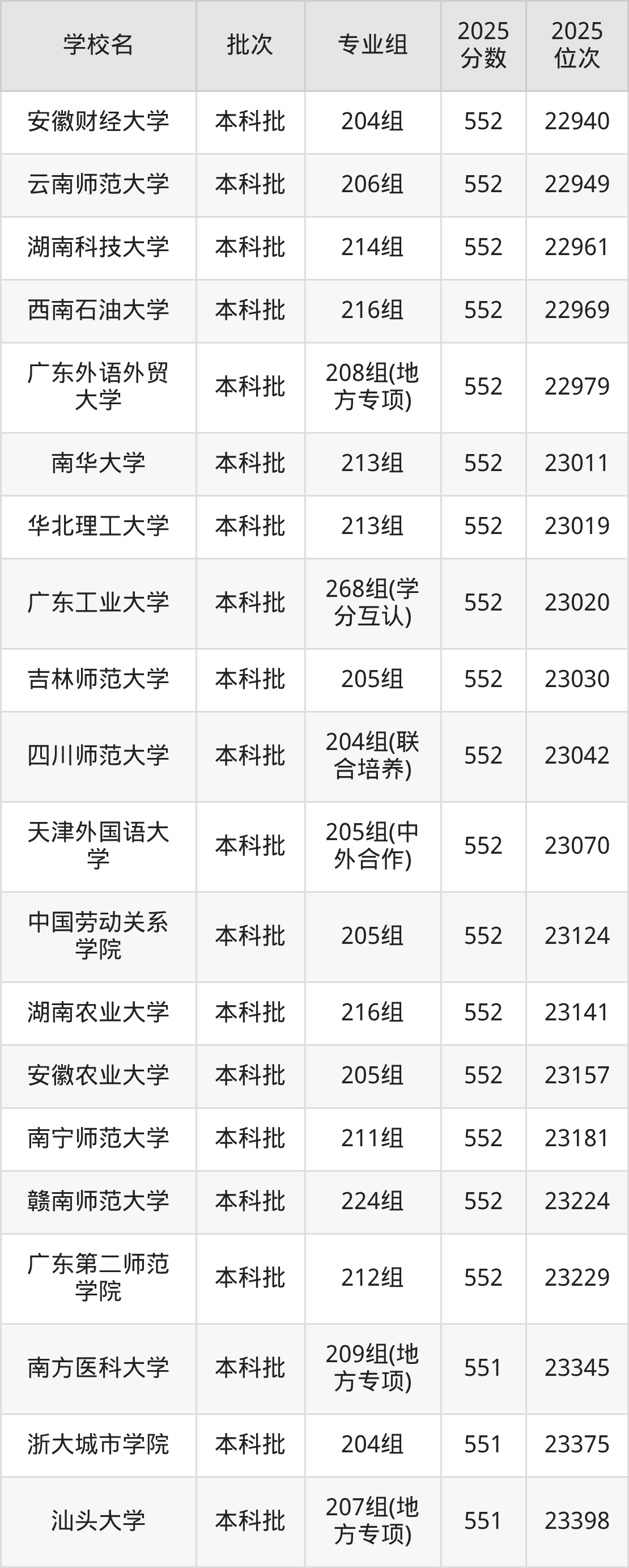 2025年广东高考历史类552分(22813名~23298名)能上的大学有天津外国语大学205组(中外合作)、华北理工大学213组、吉林师范大学205组、安徽农业大学205组等。