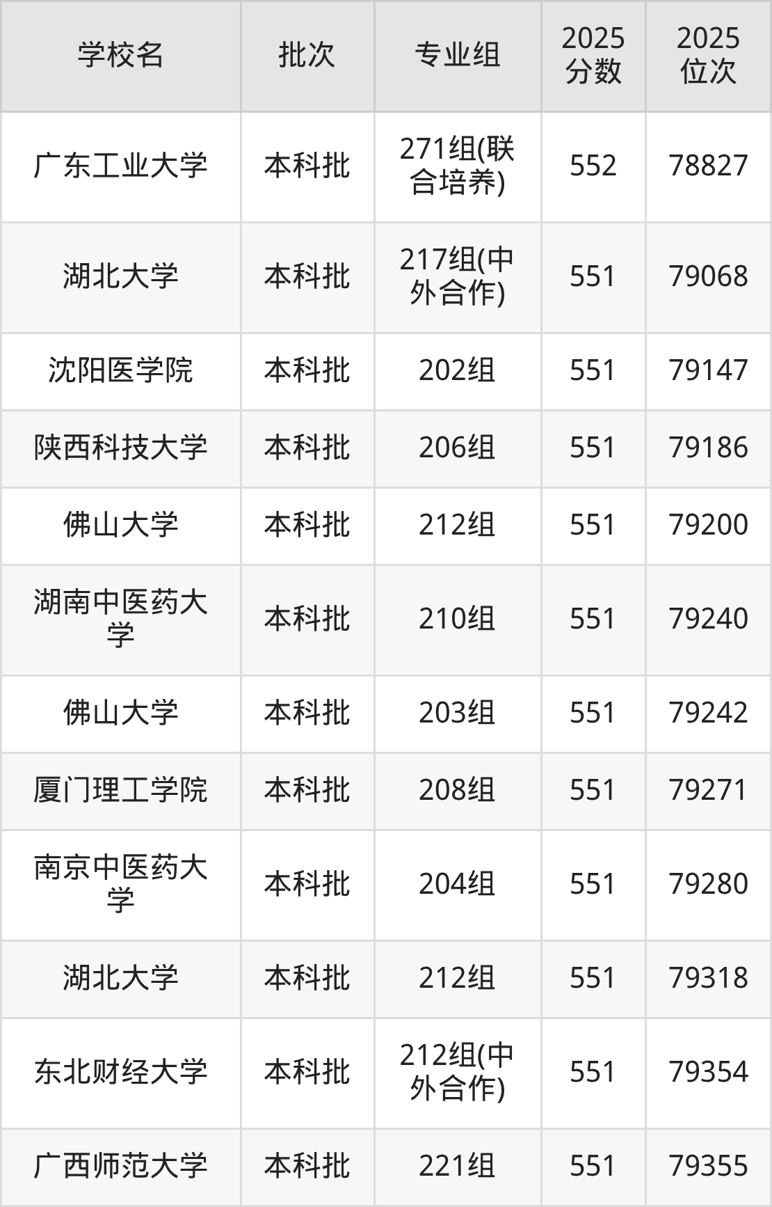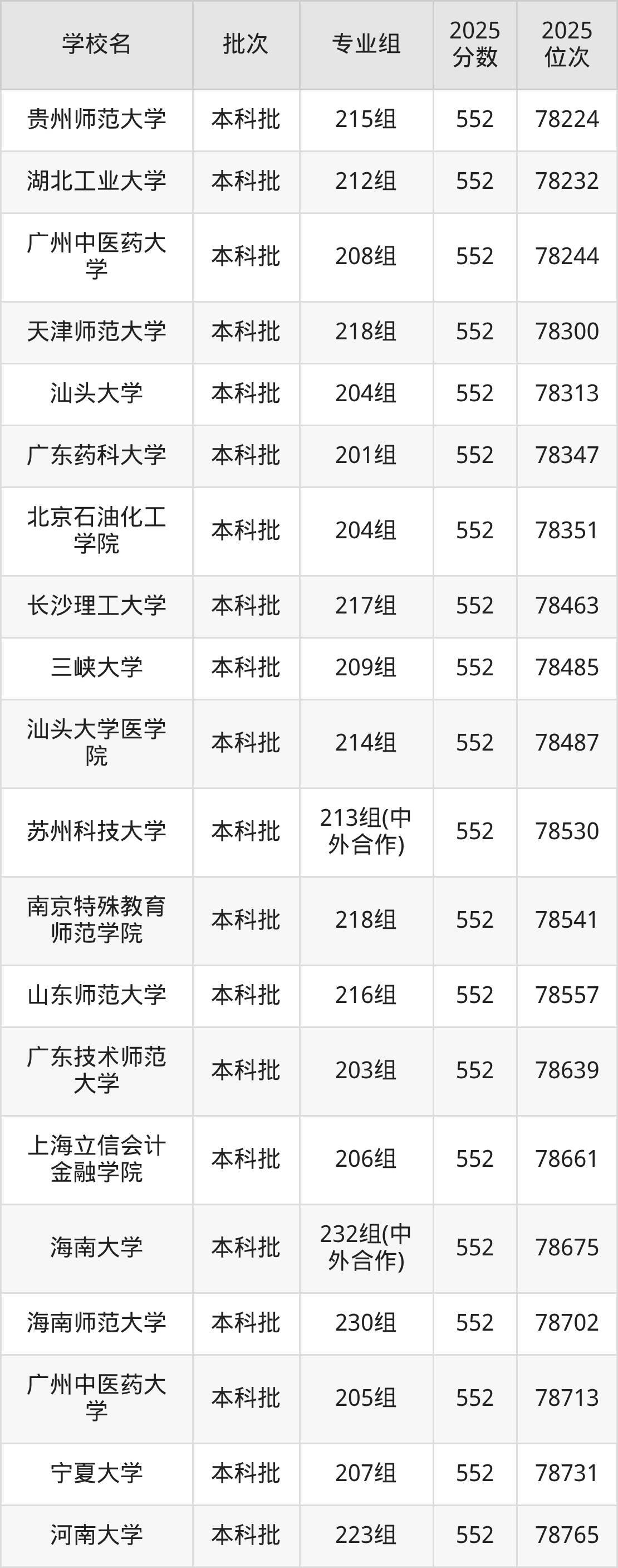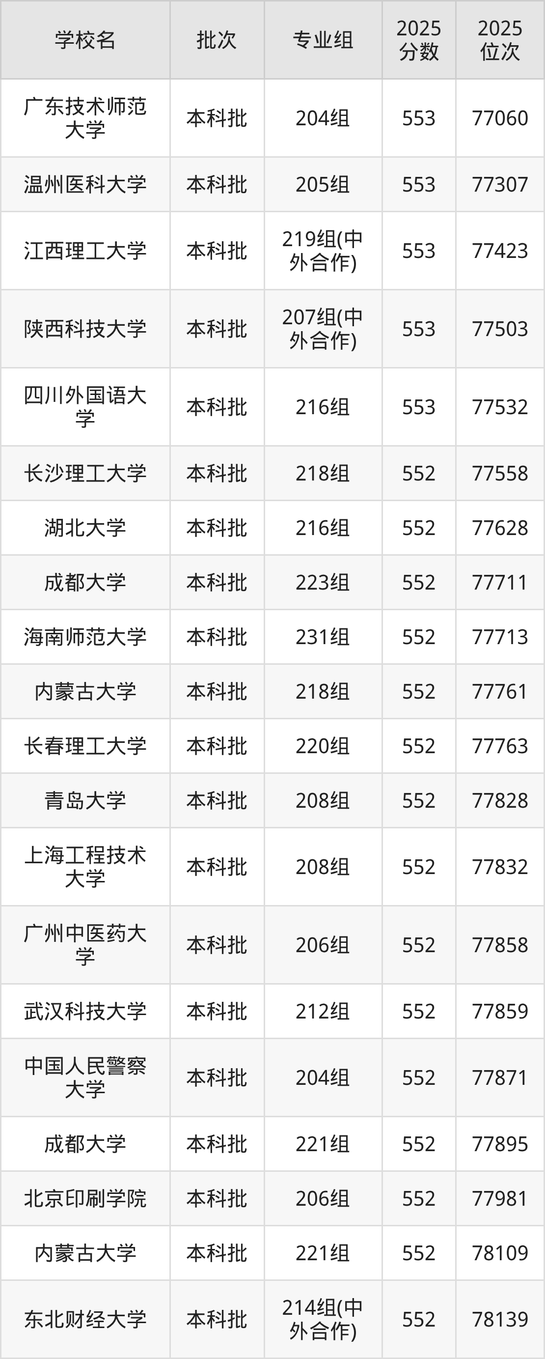 2025年广东高考物理类552分(77555名~78904名)能上的大学有北京印刷学院206组、北京石油化工学院204组、天津师范大学218组、内蒙古大学218组等。