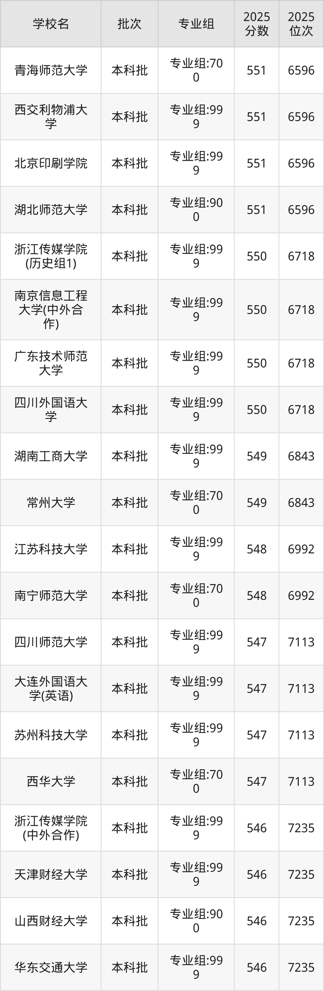 这些都是2026年高考历史类6993名~7113名考生可以报考的大学,更多学校名单如下表所示: