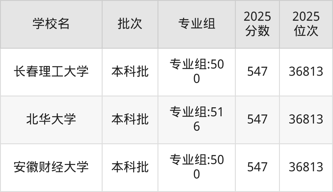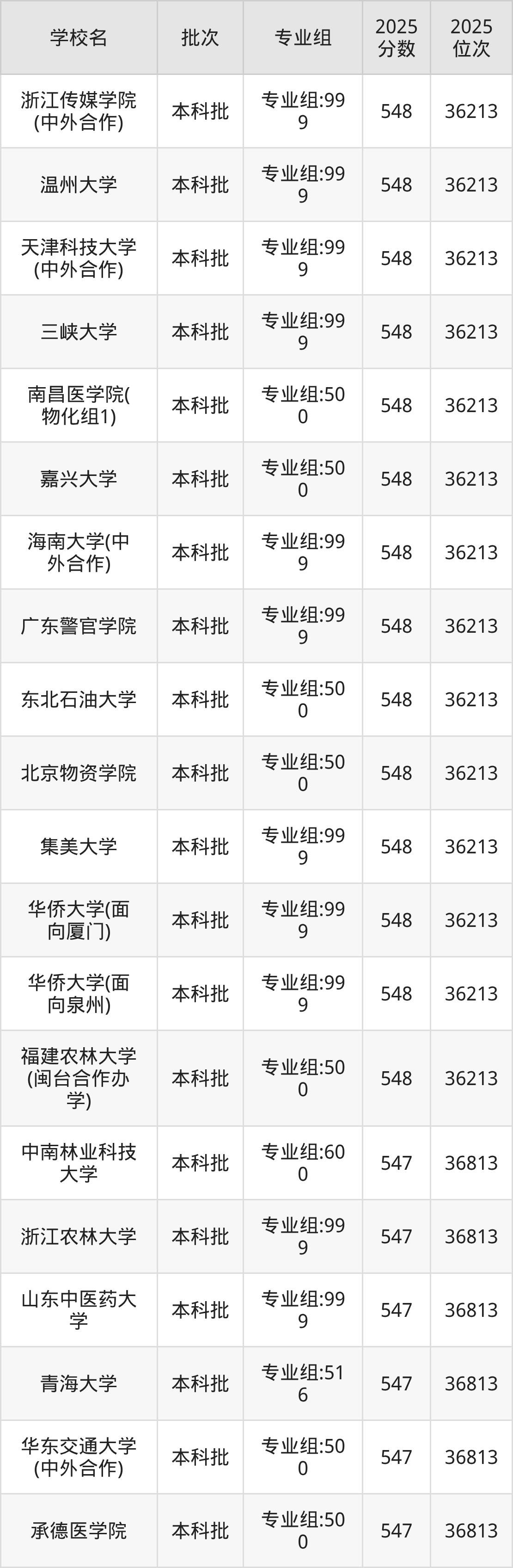 2025年福建高考物理类547分(36214名~36813名)能上的大学有安徽财经大学专业组:500、北华大学专业组:516、长春理工大学专业组:500、承德医学院专业组:500等。
