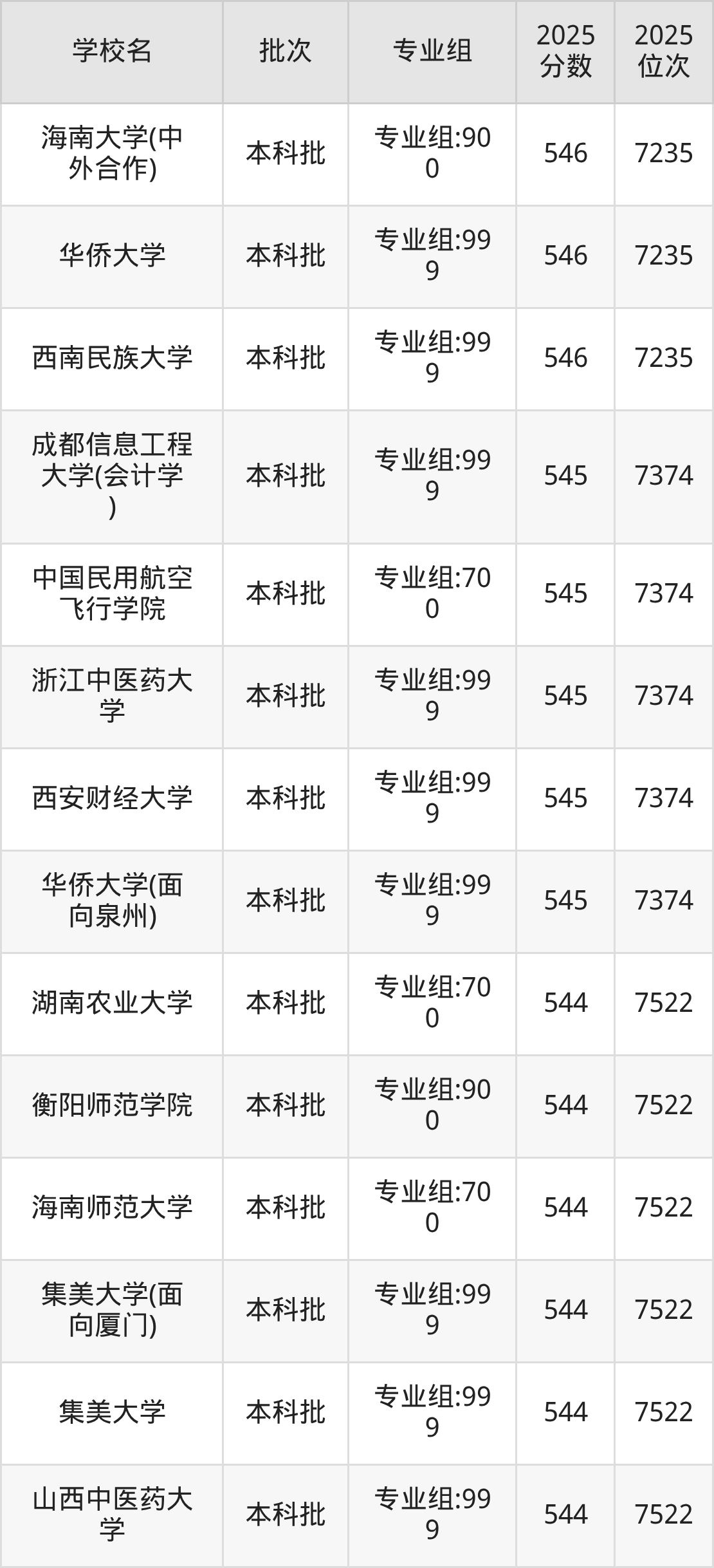 另外录取位次低于该区间(较稳妥)的有海南大学(中外合作)专业组:900(7235名)、西南民族大学专业组:999(7235名)等;录取位次高于该区间(可冲)的有江苏科技大学专业组:999(6992名)、南宁师范大学专业组:700(6992名)等。