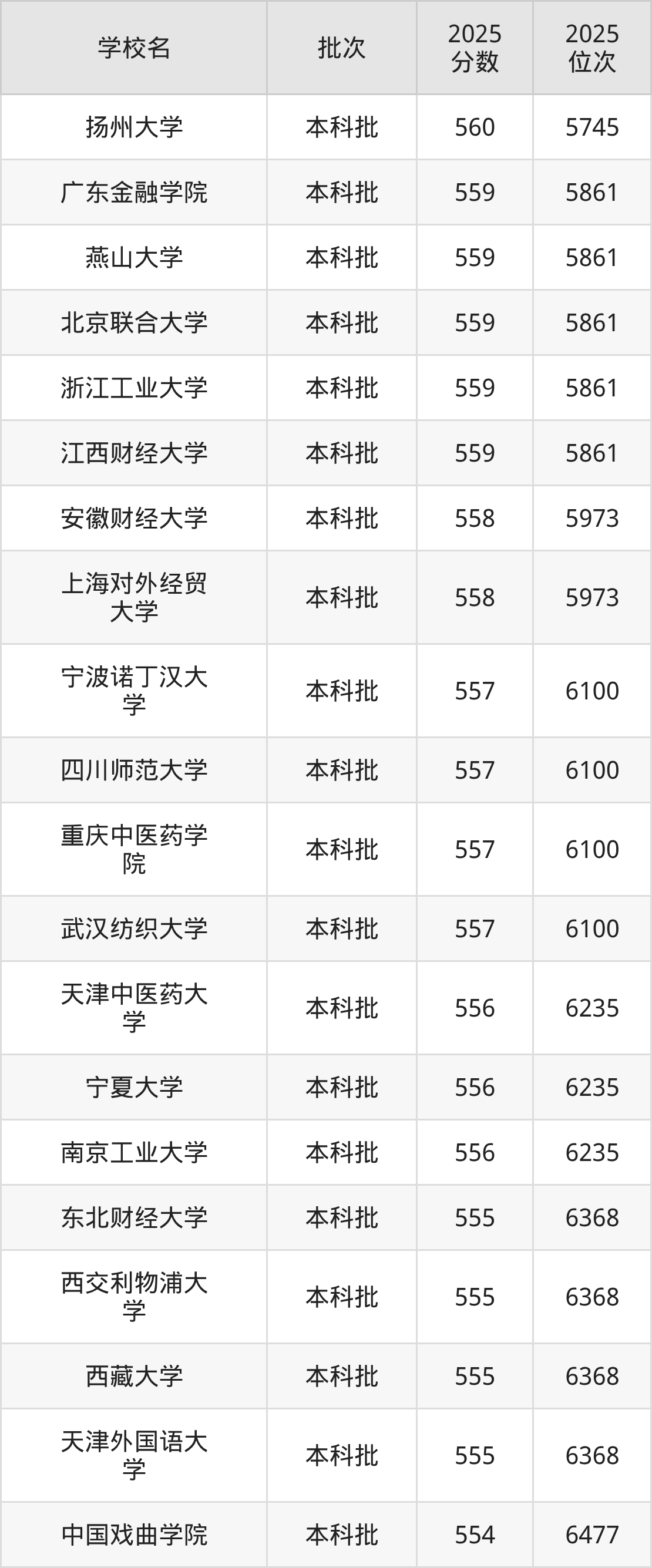 2025年辽宁高考历史类555分(6236名~6368名)能上的大学有东北财经大学、天津外国语大学、西藏大学、西交利物浦大学。