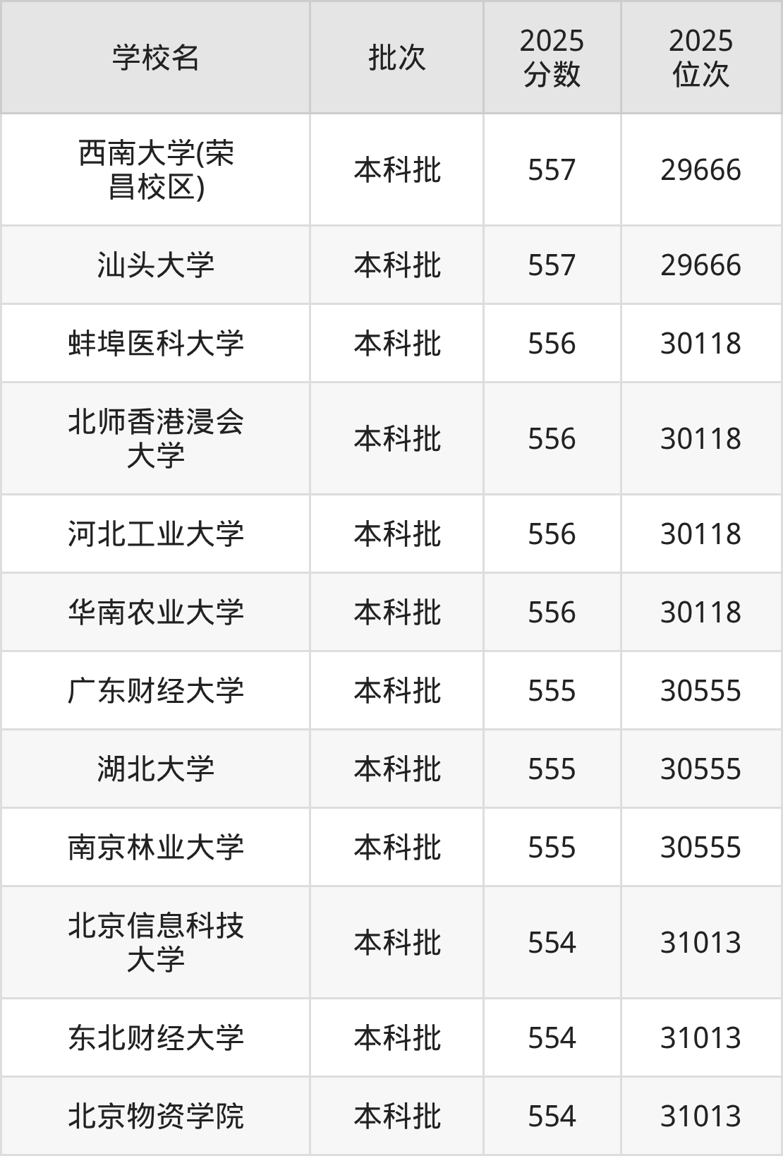 这些都是2026年高考物理类30119名~30555名考生可以报考的大学,更多学校名单如下表所示:
