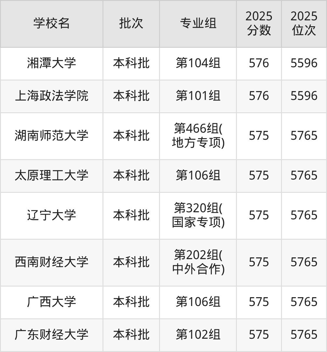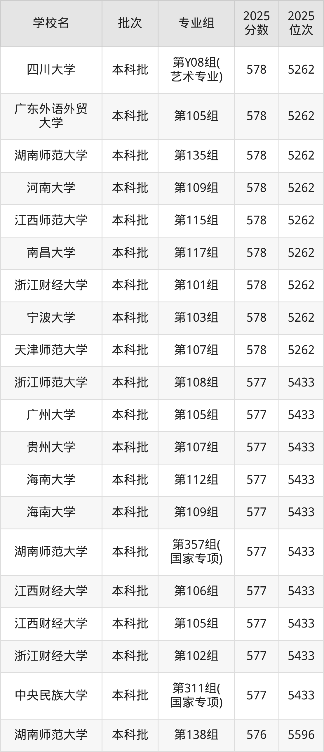2025年湖南高考历史类577分(5263名~5433名)能上的大学有中央民族大学第311组(国家专项)、浙江师范大学第108组、浙江财经大学第102组、江西财经大学第105组等。