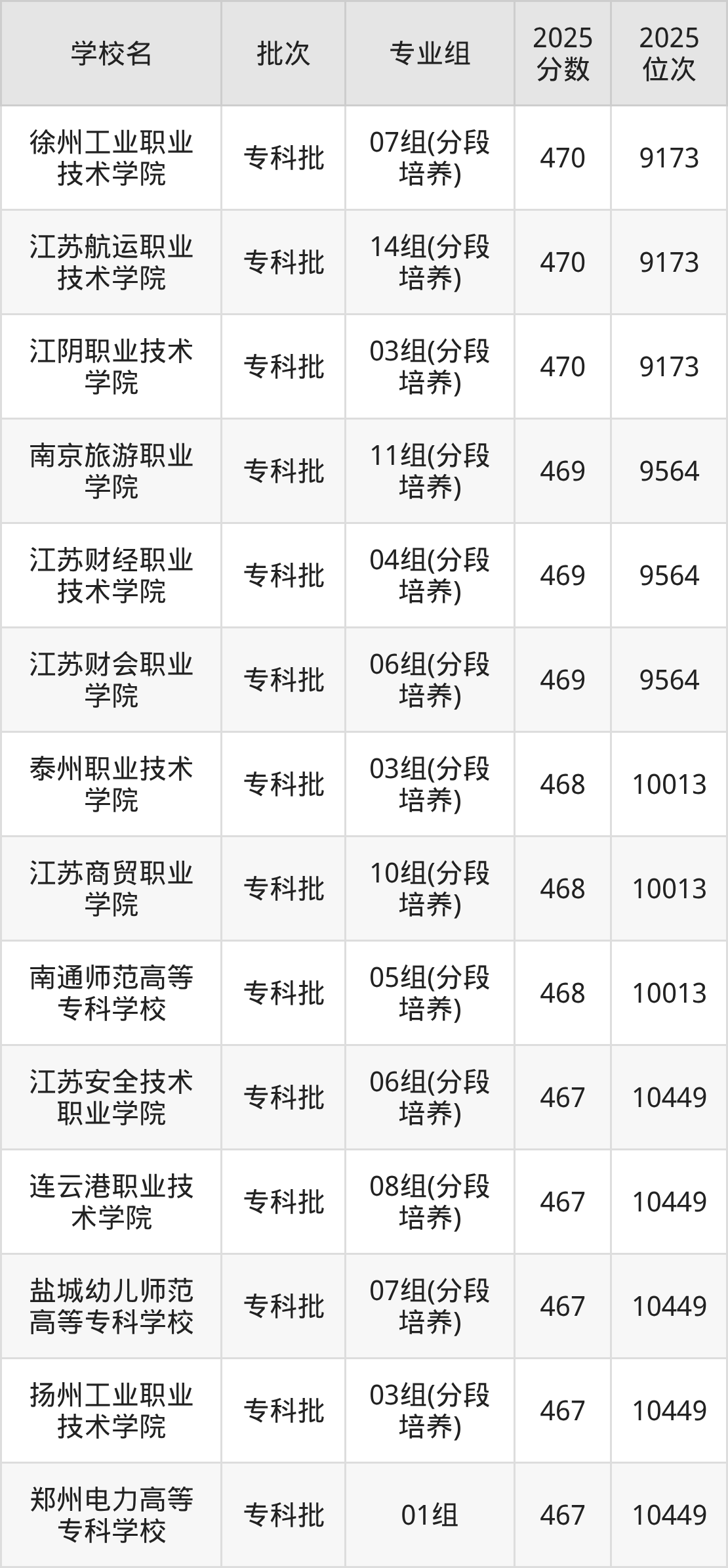 另外录取位次低于该区间(较稳妥)的有盐城幼儿师范高等专科学校07组(分段培养)(10449名)、江苏安全技术职业学院06组(分段培养)(10449名)等;录取位次高于该区间(可冲)的有北京科技大学天津学院03组(200008名)、三江学院03组(200008名)等。