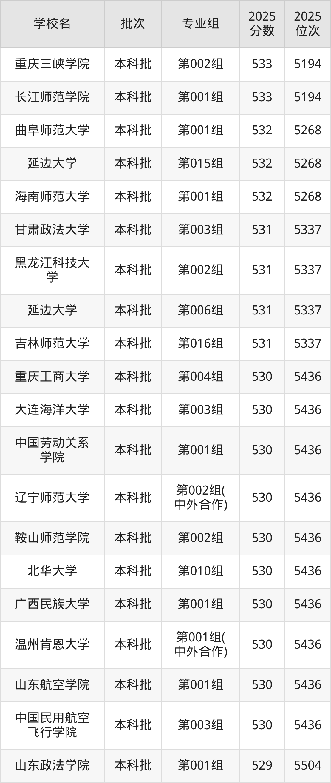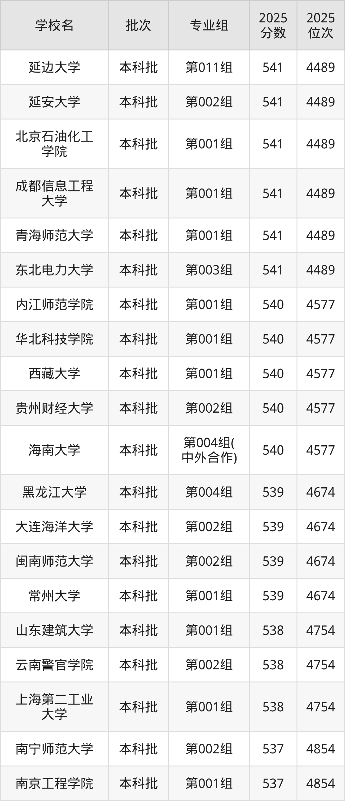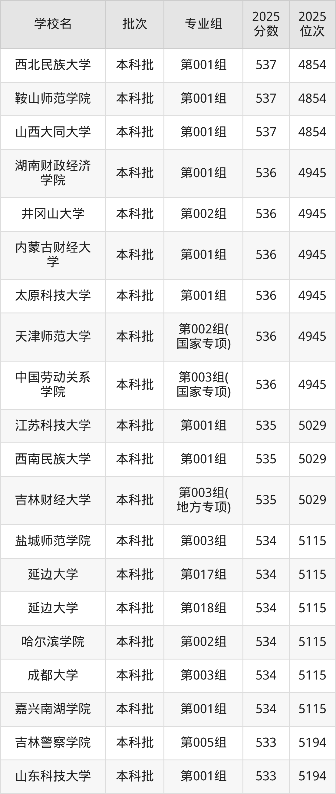 2025年吉林高考历史类535分(4946名~5029名)能上的大学有吉林财经大学第003组(地方专项)、江苏科技大学第001组、西南民族大学第001组。