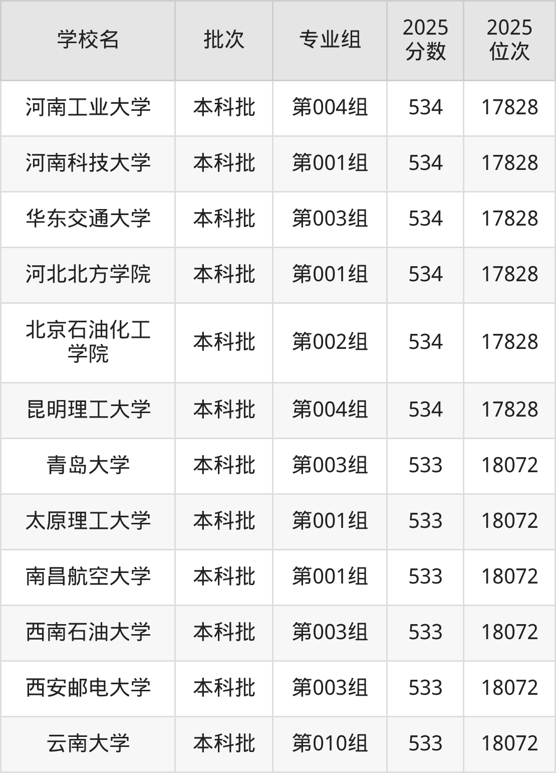 另外录取位次低于该区间(较稳妥)的有河南科技大学第001组(17828名)、北京石油化工学院第002组(17828名)等;录取位次高于该区间(可冲)的有北京印刷学院第005组(17331名)、大连工业大学第014组(17331名)等。