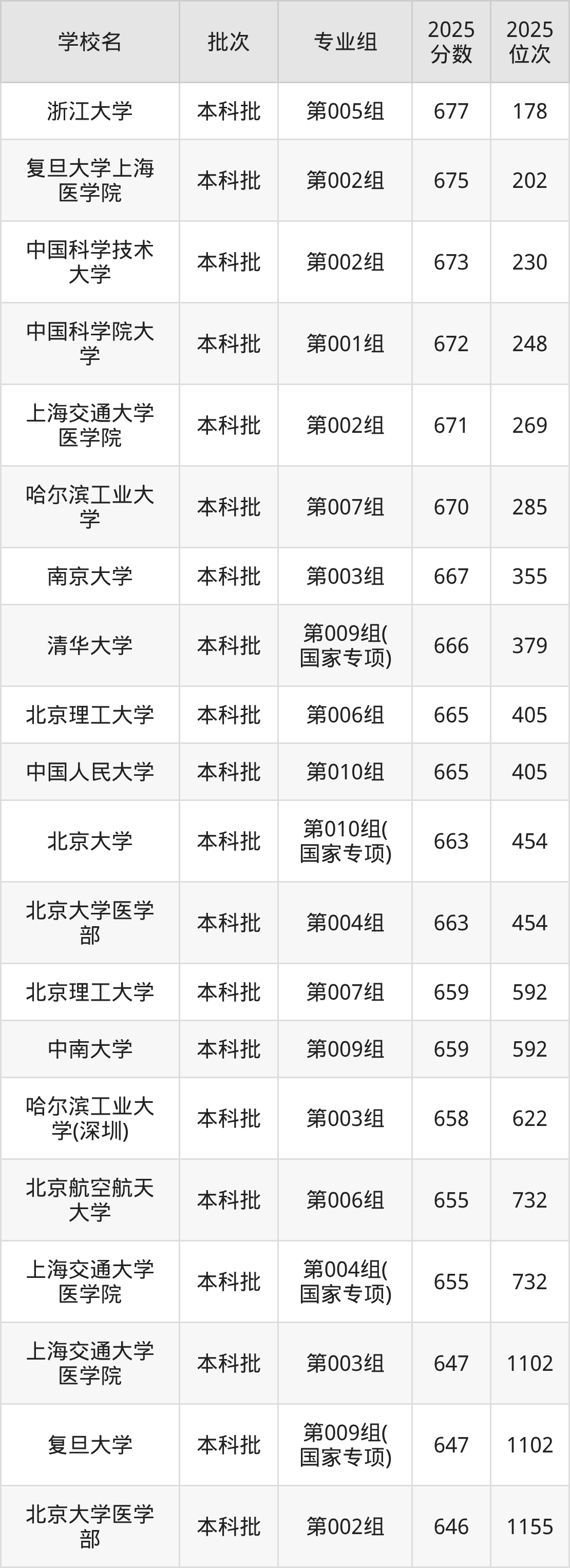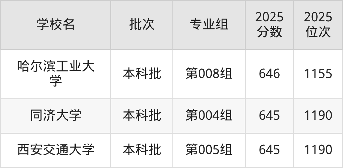 2025年黑龙江高考物理类656分(661名~701名)录取位次低于该区间(较稳妥)的有上海交通大学医学院第004组(国家专项)(732名)、北京航空航天大学第006组(732名)等;录取位次高于该区间(可冲)的有哈尔滨工业大学(深圳)第003组(622名)、北京理工大学第007组(592名)等。