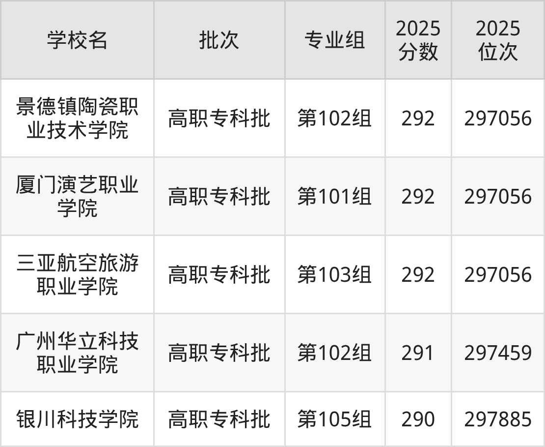 另外录取位次低于该区间(较稳妥)的有重庆信息技术职业学院第103组(298680名)、泉州华光职业学院第101组(298680名)等;录取位次高于该区间(可冲)的有广州华立科技职业学院第102组(297459名)、厦门演艺职业学院第101组(297056名)等。
