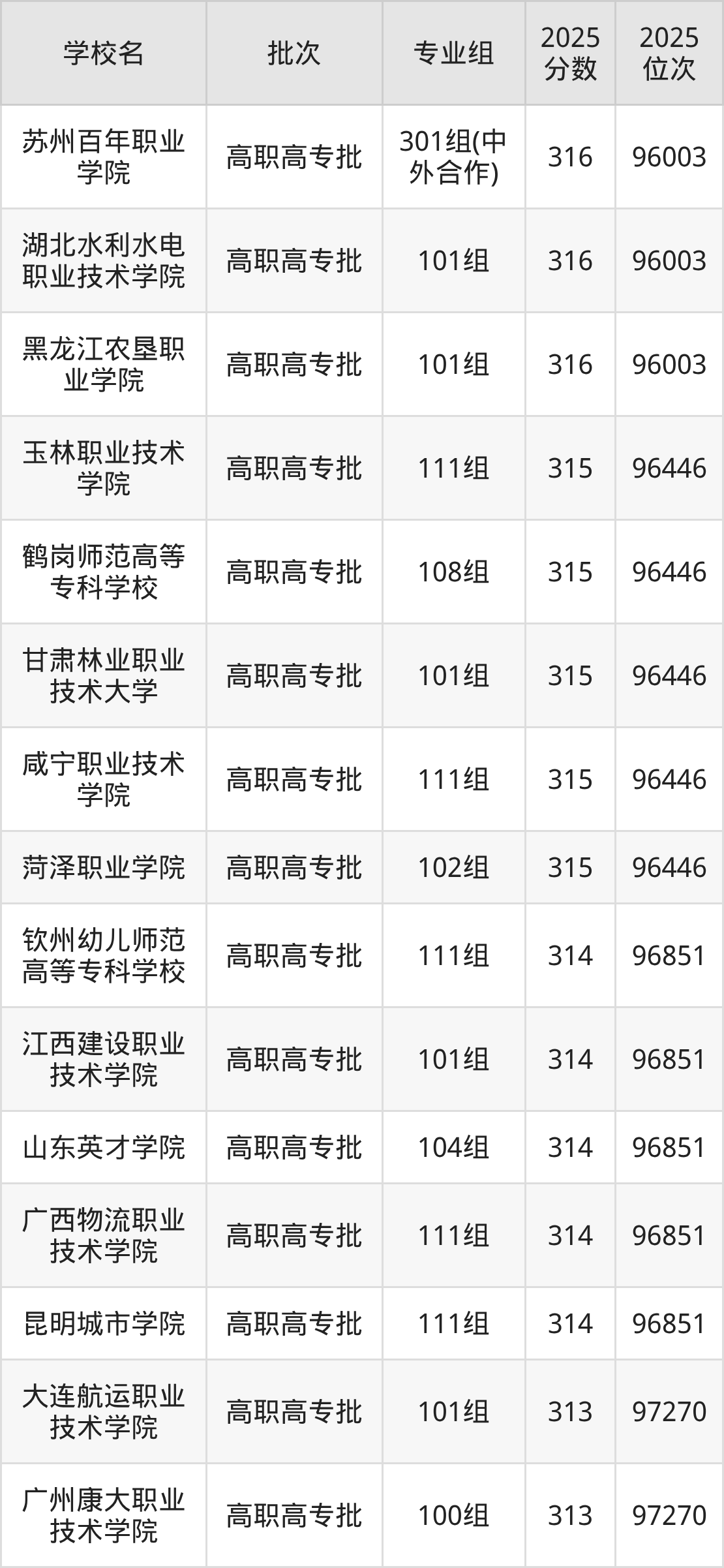 2025年广西高考历史类314分(96447名~96851名)能上的大学有山东英才学院104组、昆明城市学院111组、江西建设职业技术学院101组、钦州幼儿师范高等专科学校111组等。