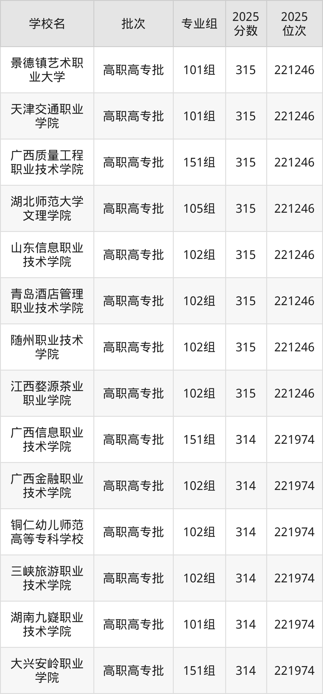 2025年广西高考物理类314分(221247名~221974名)能上的大学有大兴安岭职业学院151组、湖南九嶷职业技术学院101组、三峡旅游职业技术学院102组、铜仁幼儿师范高等专科学校102组等。