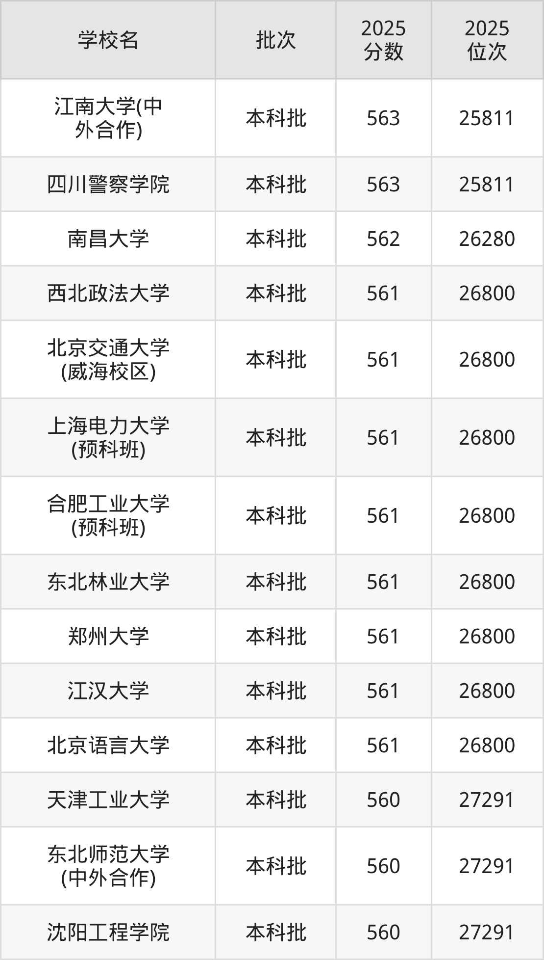 2025年重庆高考物理类561分(26281名~26800名)能上的大学有西北政法大学、北京语言大学、郑州大学、北京交通大学(威海校区)等。