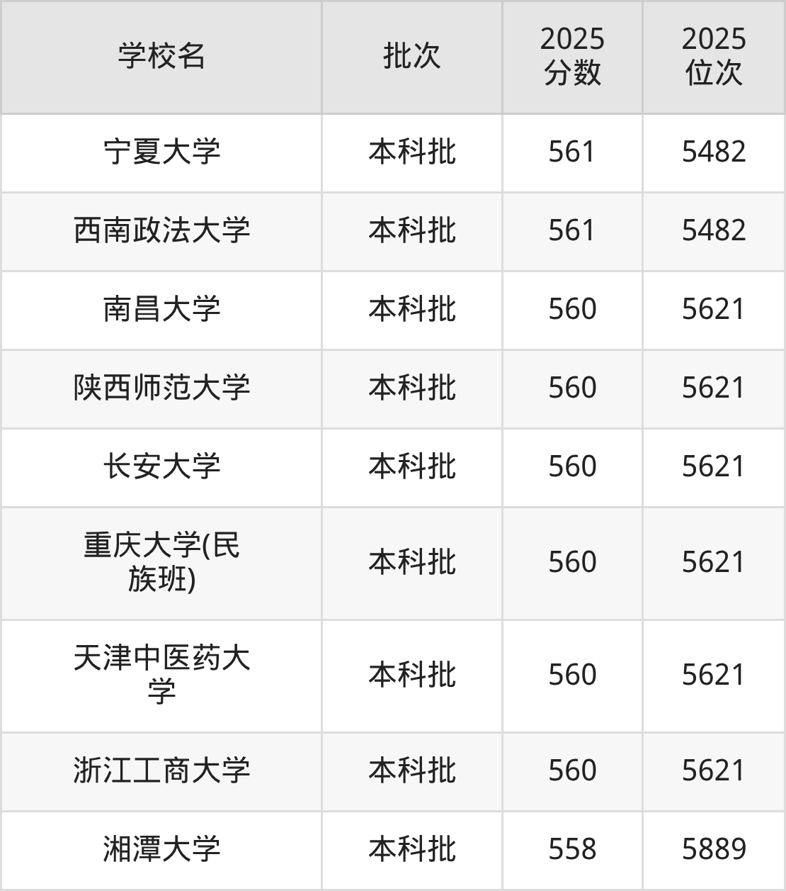 2025年重庆高考历史类561分(5335名~5482名)能上的大学有西南政法大学、宁夏大学。
