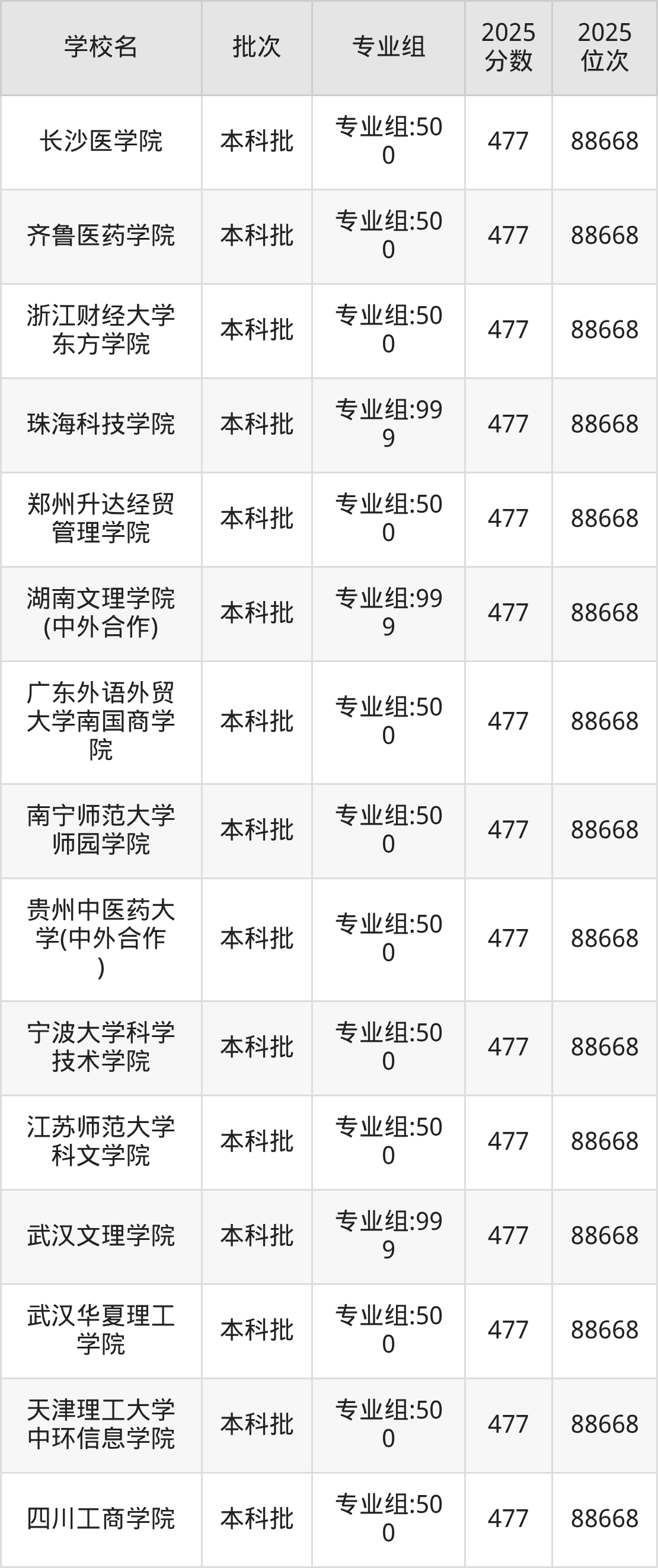 2025年福建高考物理类477分(87829名~88668名)能上的大学有长沙医学院专业组:500、广东外语外贸大学南国商学院专业组:500、贵州中医药大学(中外合作)专业组:500、湖南文理学院(中外合作)专业组:999等。
