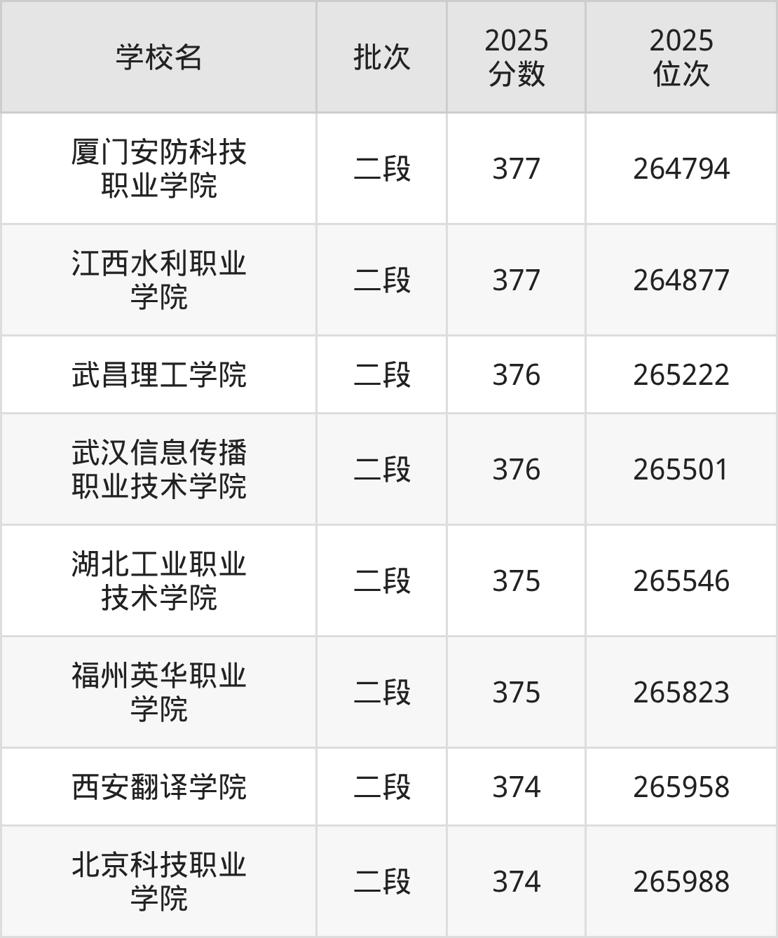 另外录取位次低于该区间(较稳妥)的有湖北工业职业技术学院(265546名)、福州英华职业学院(265823名)等;录取位次高于该区间(可冲)的有江西水利职业学院(264877名)、厦门安防科技职业学院(264794名)等。