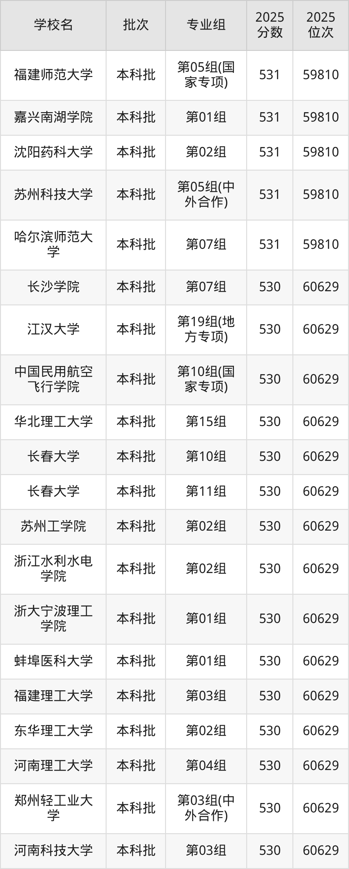 2025年湖北高考物理类530分(59811名~60629名)能上的大学有中国民用航空飞行学院第10组(国家专项)、江汉大学第19组(地方专项)、华北理工大学第15组、长春大学第10组等。