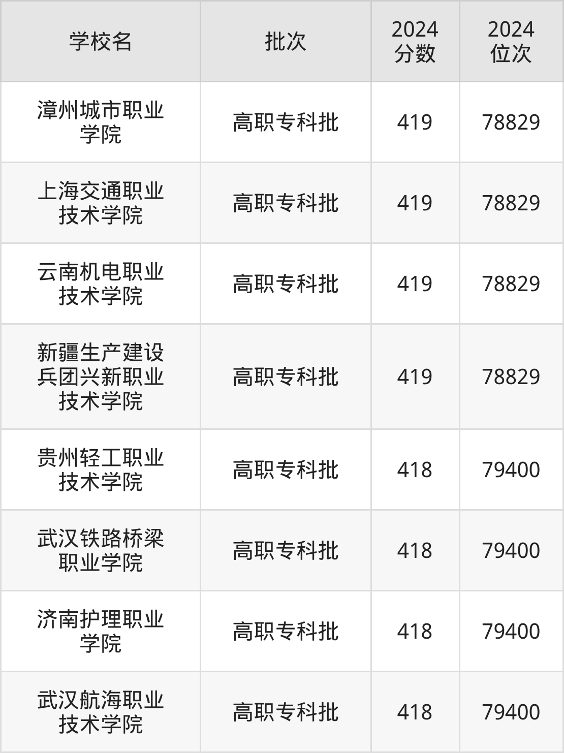 2024年云南高考文科418分(78830名~79400名)能上的大学有济南护理职业学院、武汉航海职业技术学院、武汉铁路桥梁职业学院、贵州轻工职业技术学院。