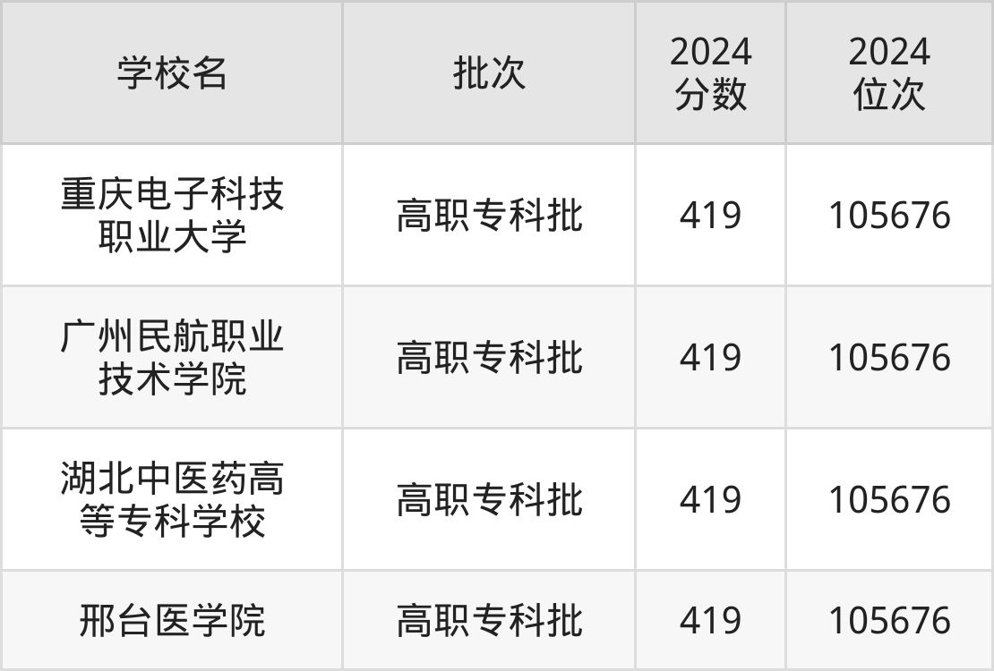 2024年云南高考理科418分(105677名~106315名)录取位次低于该区间(较稳妥)的有商丘医学高等专科学校(107006名)、遵义医药高等专科学校(107006名)等;录取位次高于该区间(可冲)的有邢台医学院(105676名)、湖北中医药高等专科学校(105676名)等。