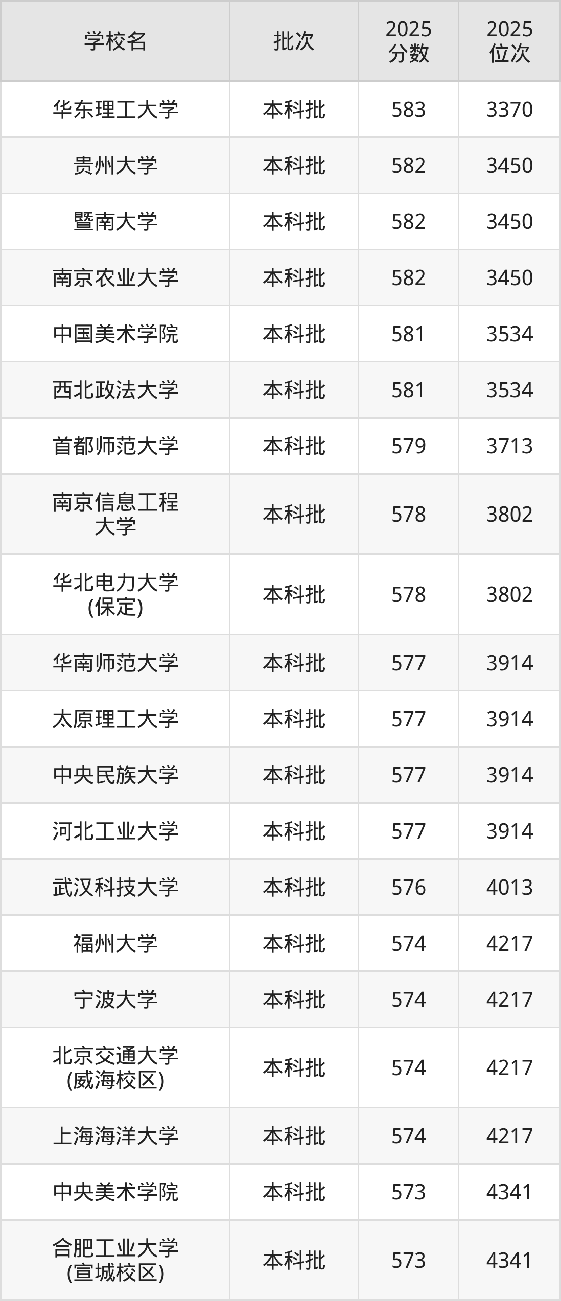 由于高考录取分数线历年波动较大,因此本文以该分数对应的位次排名为大家整理能上的大学名单。