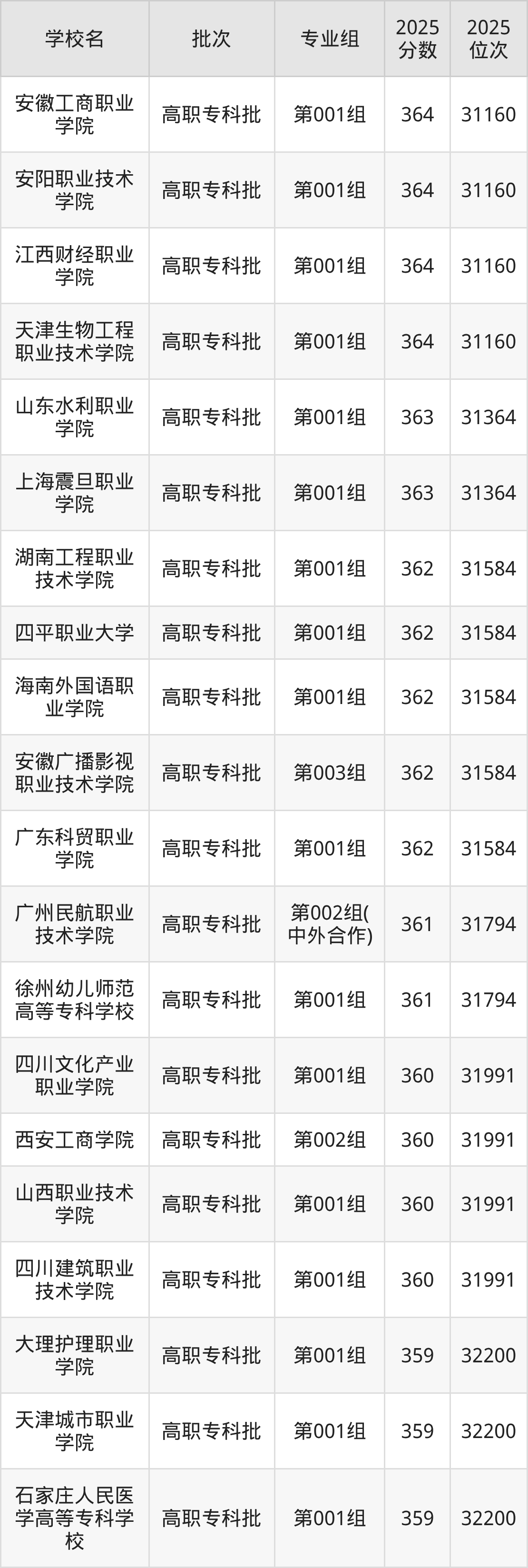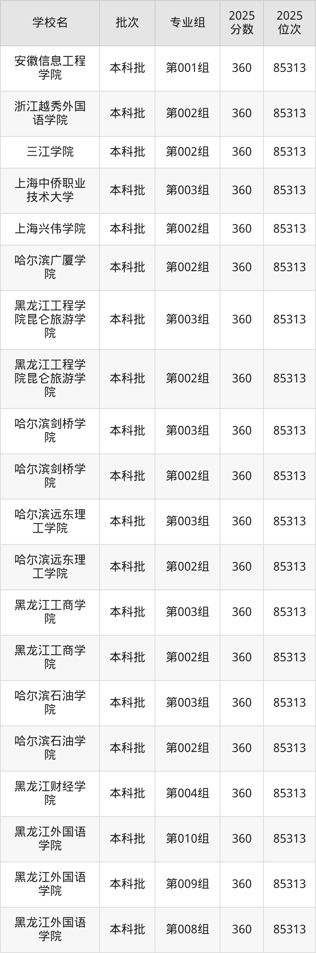 2025年黑龙江高考历史类361分(31585名~31794名)能上的大学有徐州幼儿师范高等专科学校第001组、广州民航职业技术学院第002组(中外合作)。
