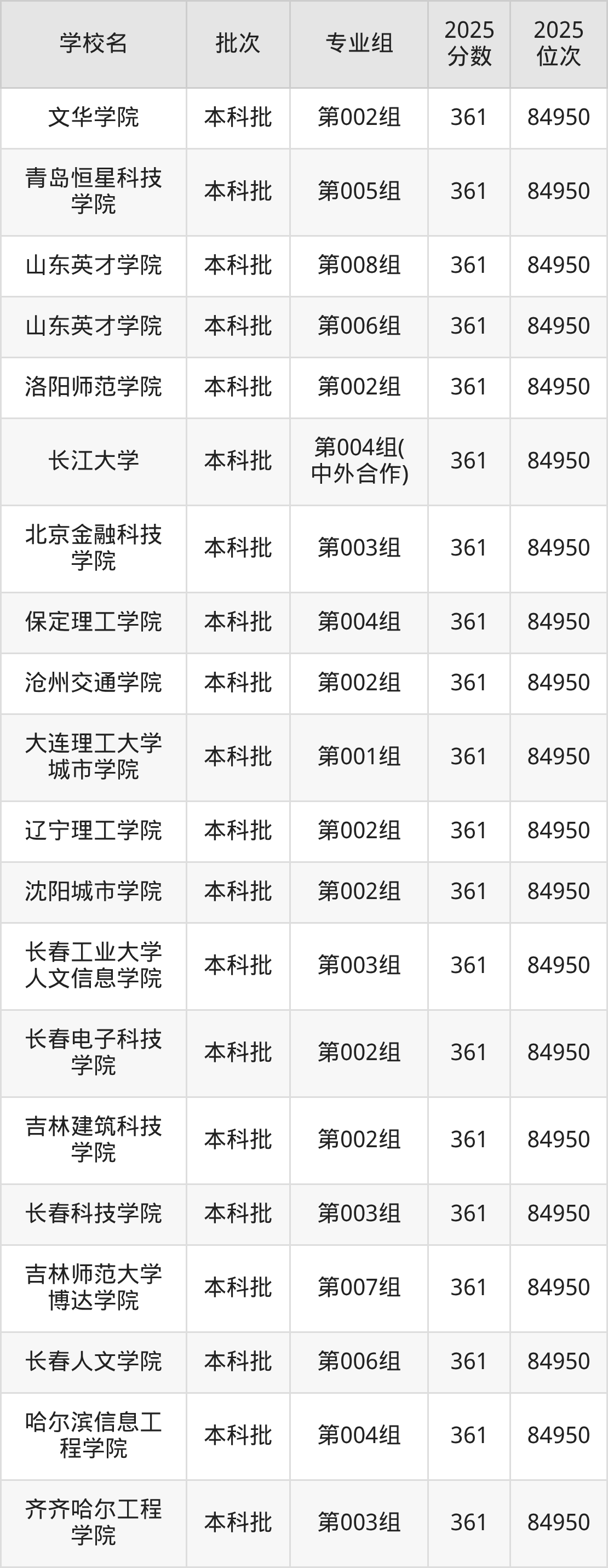 2025年黑龙江高考物理类361分(84595名~84950名)能上的大学有洛阳师范学院第002组、长江大学第004组(中外合作)、北京金融科技学院第003组、保定理工学院第004组等。