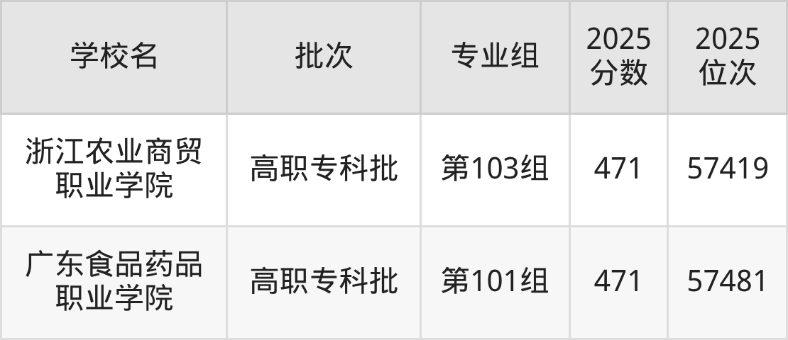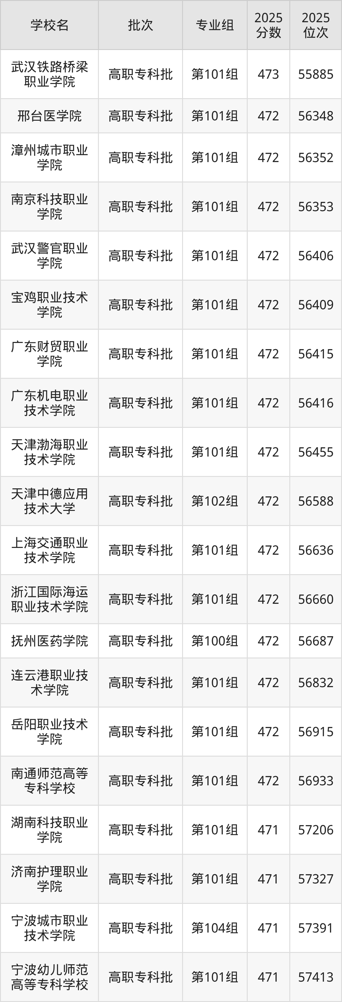 另外录取位次低于该区间(较稳妥)的有湖南科技职业学院第101组(57206名)、济南护理职业学院第101组(57327名)等;录取位次高于该区间(可冲)的有武汉铁路桥梁职业学院第101组(55885名)、漳州卫生职业学院第101组(55763名)等。