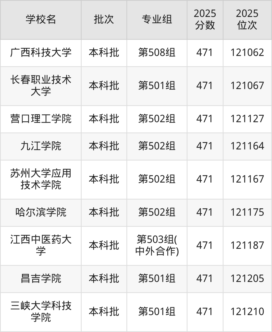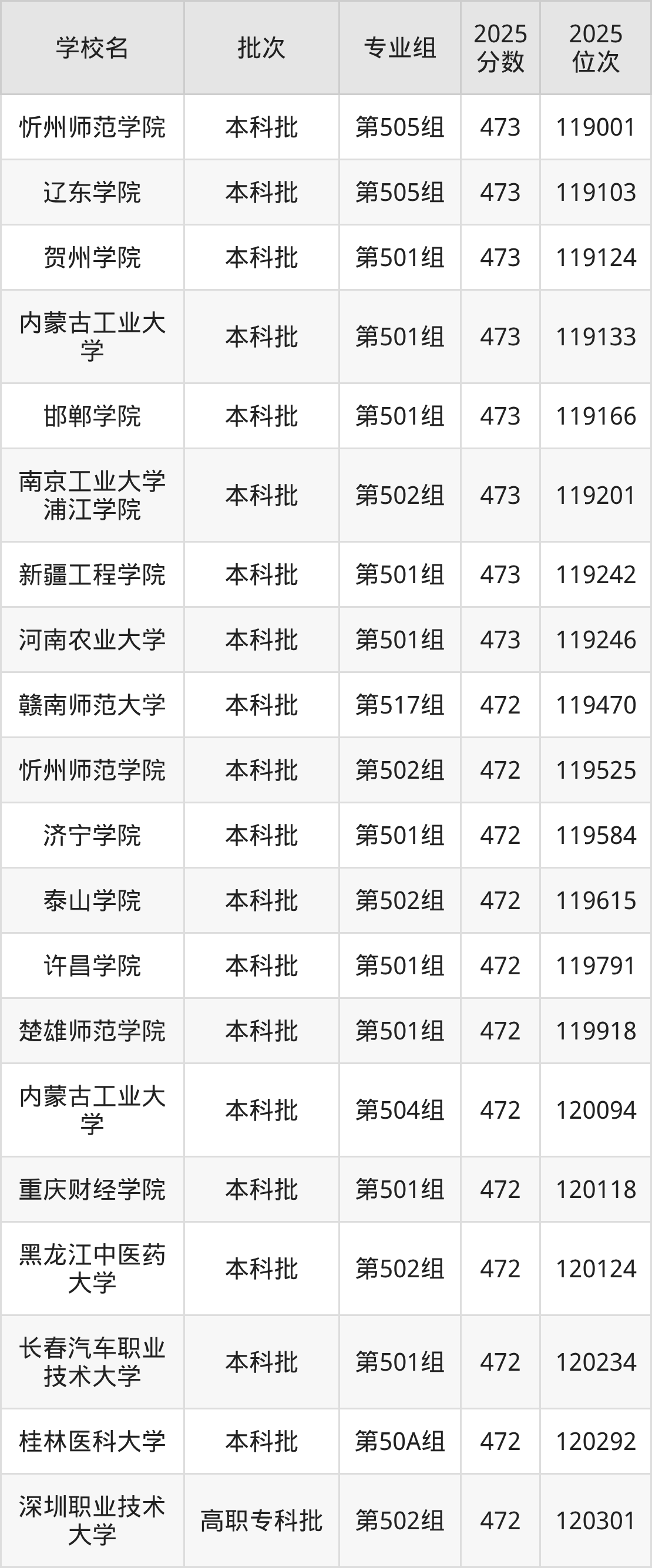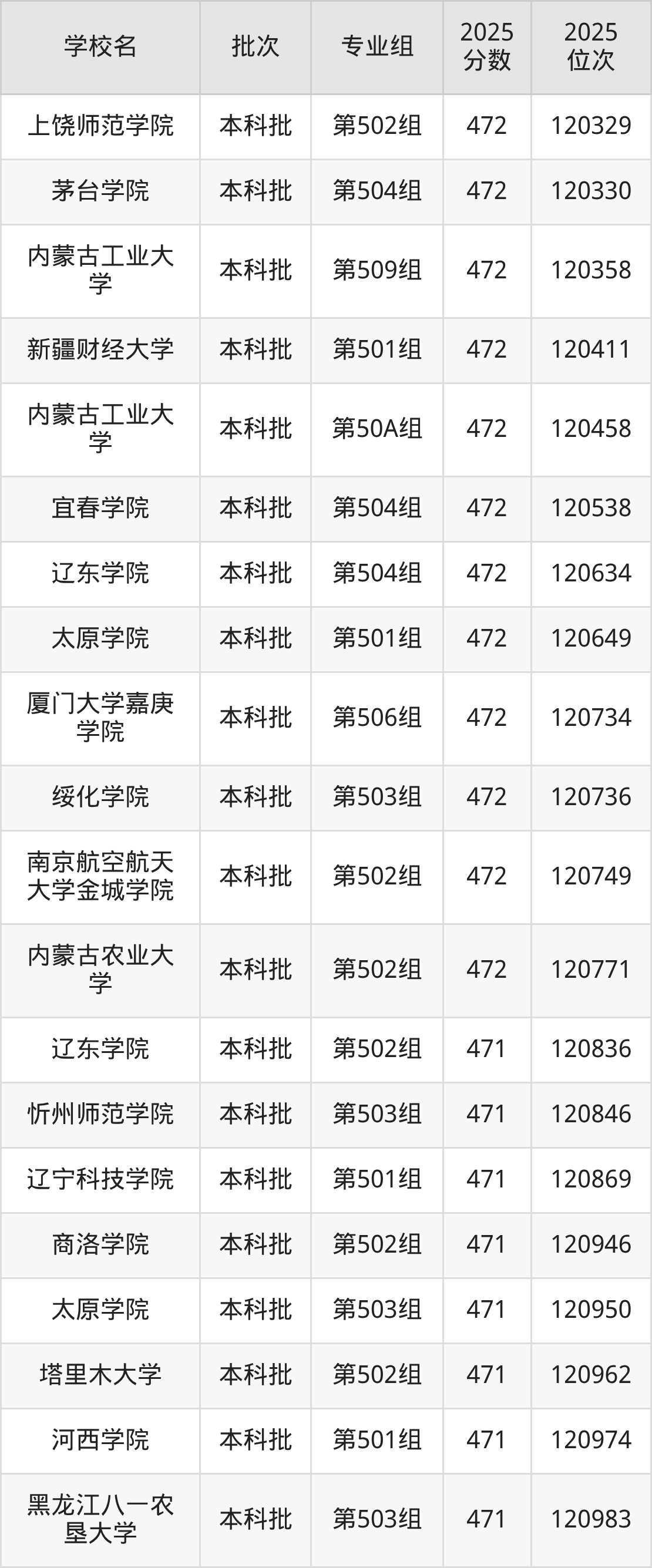 2025年江西高考物理类472分(119468名~120774名)能上的大学有黑龙江中医药大学第502组、太原学院第501组、忻州师范学院第502组、内蒙古农业大学第502组等。