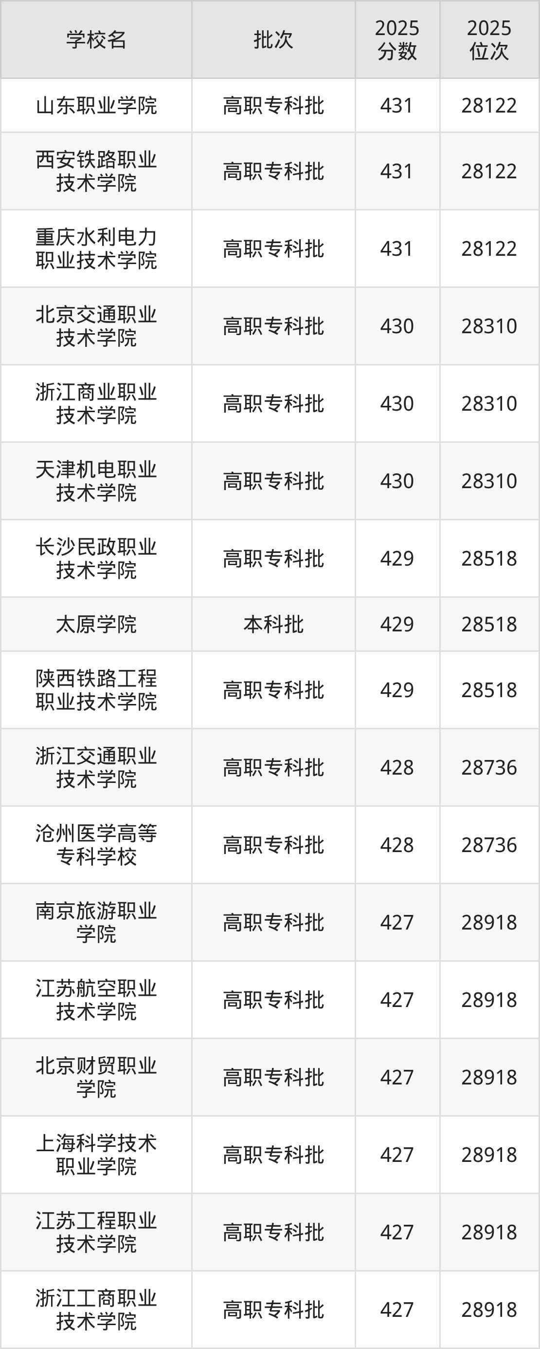 2025年辽宁高考历史类429分(28311名~28518名)能上的大学有陕西铁路工程职业技术学院、太原学院、长沙民政职业技术学院。