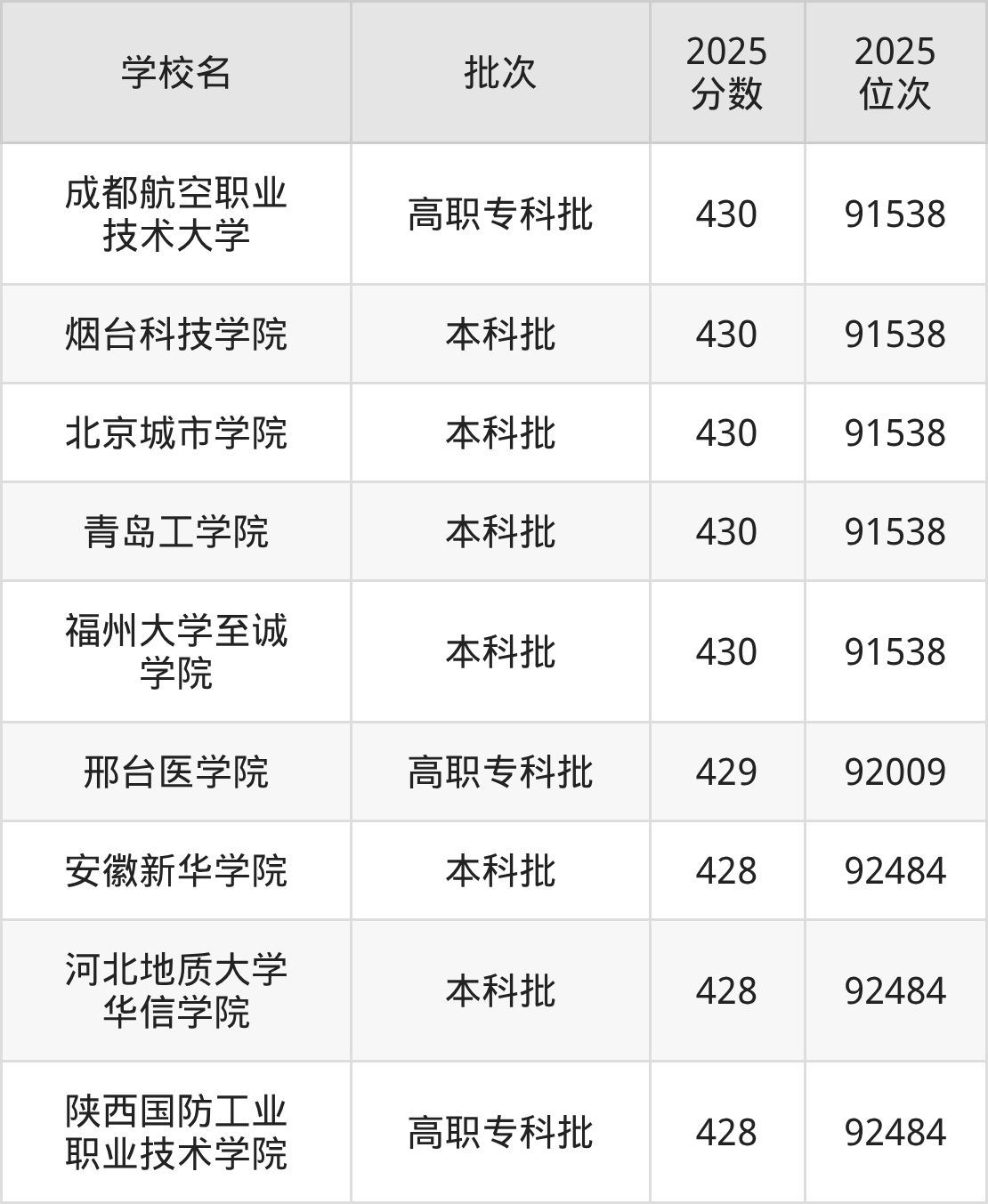 这些都是2026年高考物理类91539名~92009名考生可以报考的大学,更多学校名单如下表所示: