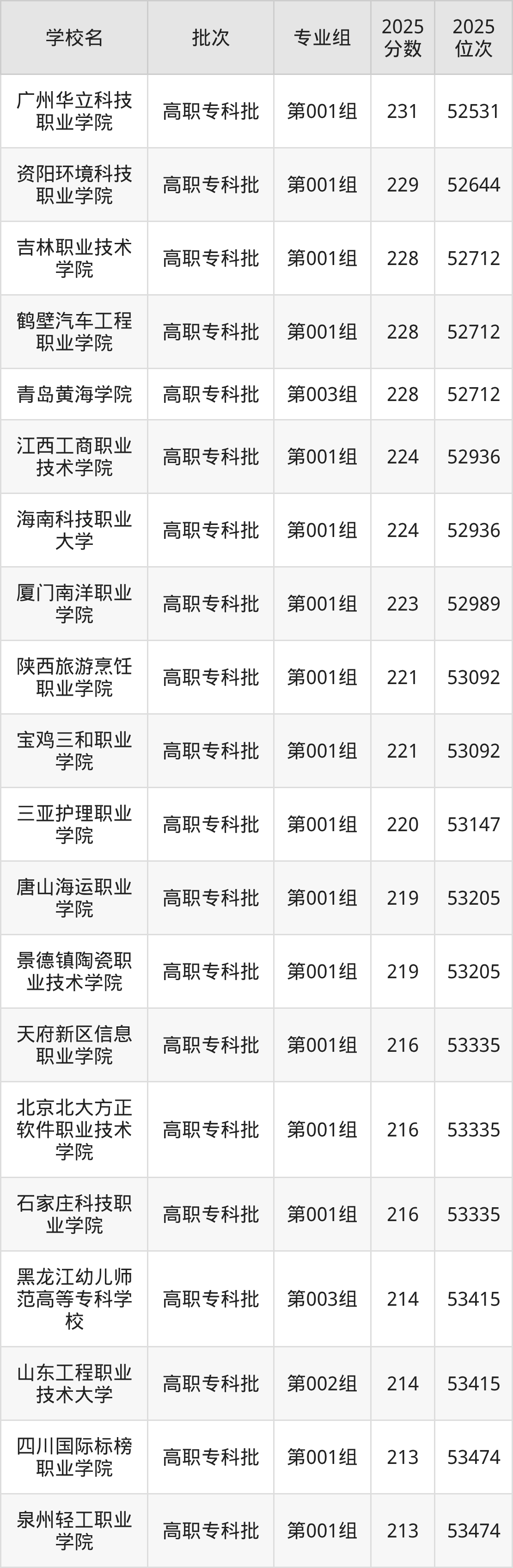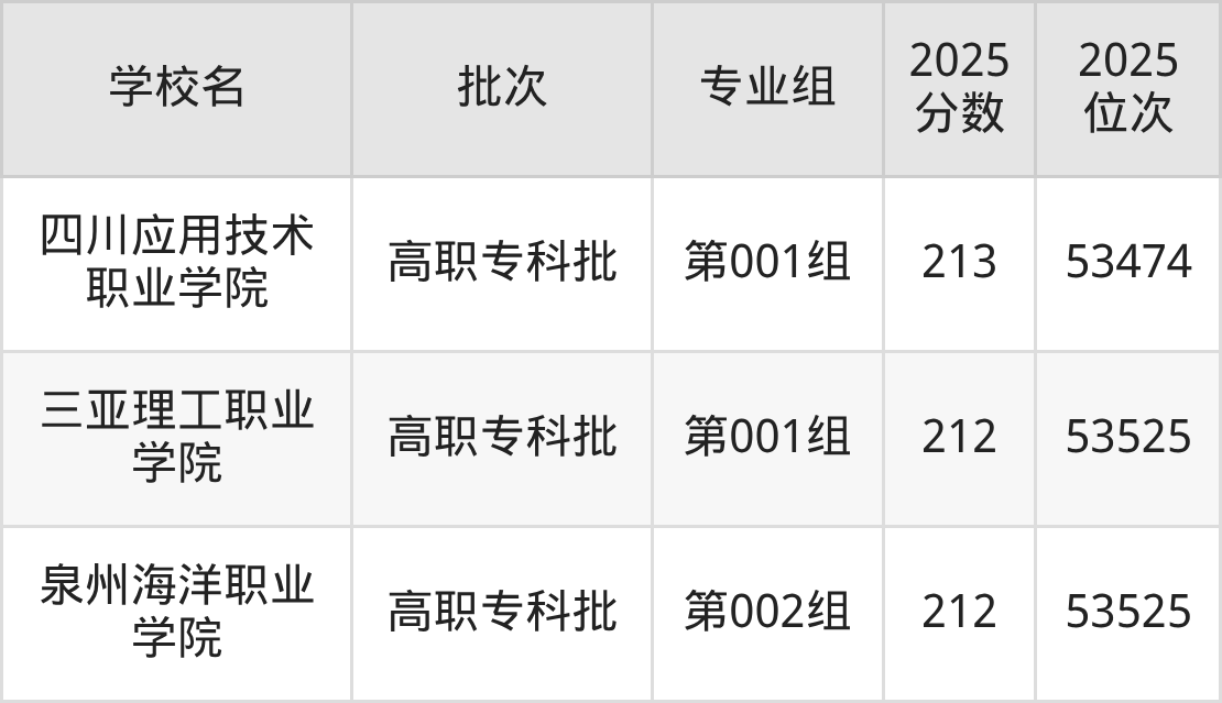 2025年黑龙江高考历史类222分(52990名~53048名)录取位次低于该区间(较稳妥)的有陕西旅游烹饪职业学院第001组(53092名)、宝鸡三和职业学院第001组(53092名)等;录取位次高于该区间(可冲)的有厦门南洋职业学院第001组(52989名)、江西工商职业技术学院第001组(52936名)等。